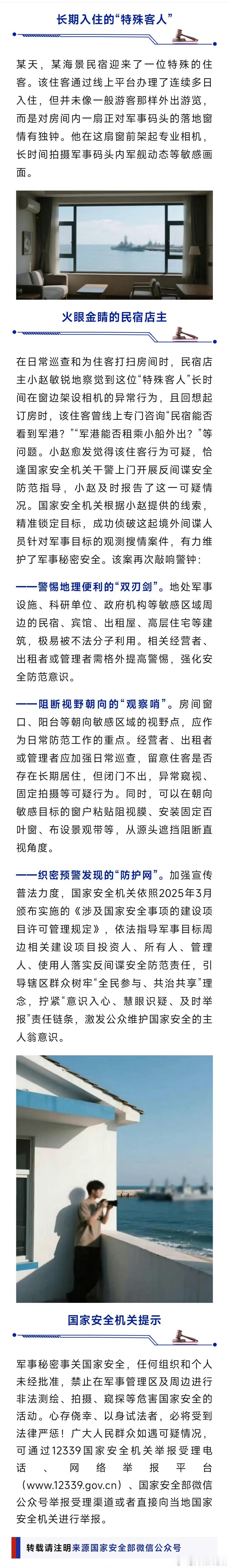 间谍在民宿拍军港被老板举报维护国家安全从不是空话,那些"闭门不出专拍摄""反复打探敏感点"的可疑举动,都值得警惕。每个普通人的警觉,都是国家安全的坚实屏障!