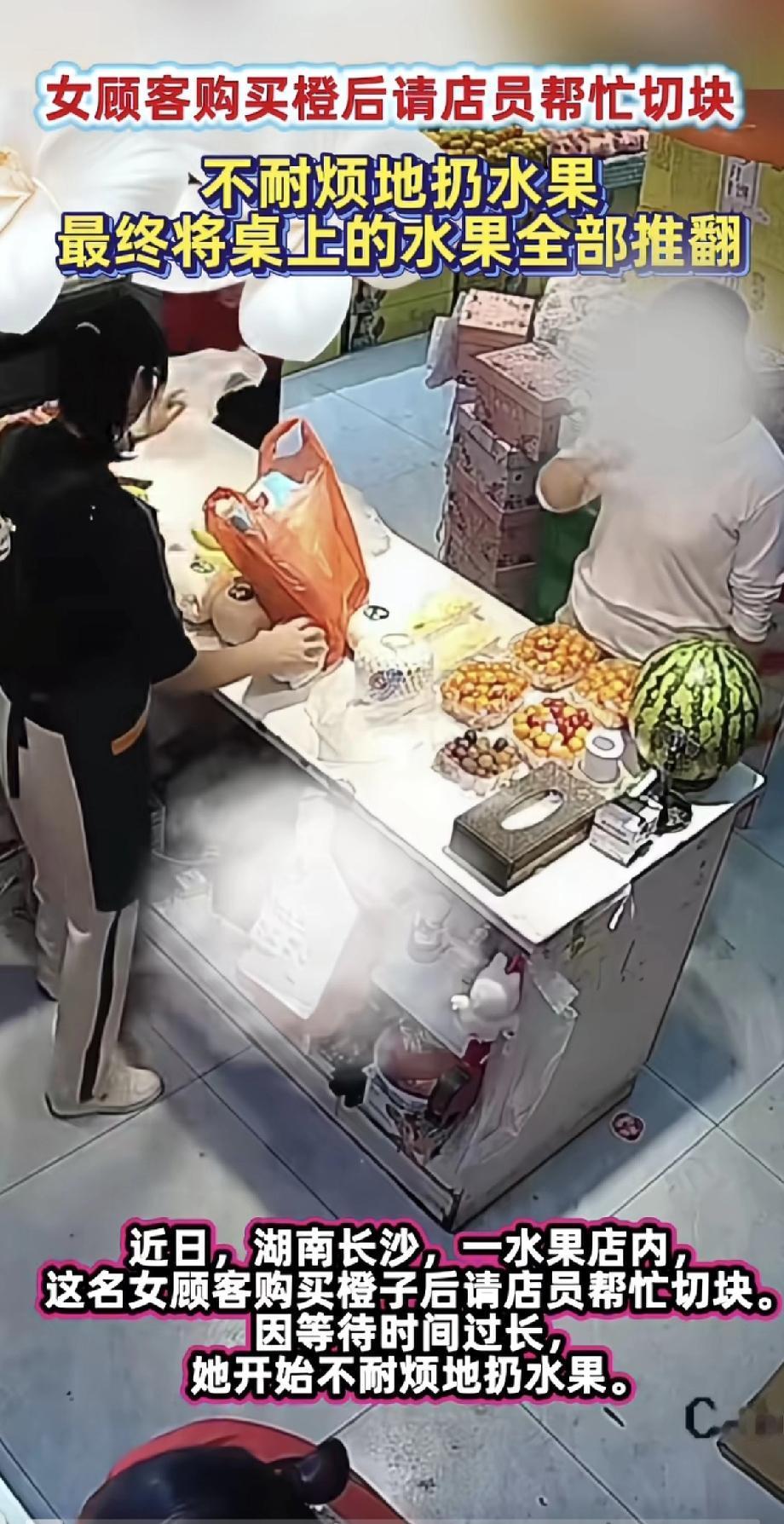 在湖南长沙一家水果店,一位女顾客买完橙子请店员帮忙切块。因为等得不耐烦,她竟然开始乱扔水果,最后直接把整桌水果都推翻了,后面有没有叫她赔钱。 这样的行为实在让人看不下去。店员提供服务需要时间,多一份耐心和理解不好吗? 公共场合控制情绪是基本修养。为这点小事大发雷霆,既失了风度又给别人添麻烦,真的不值得。