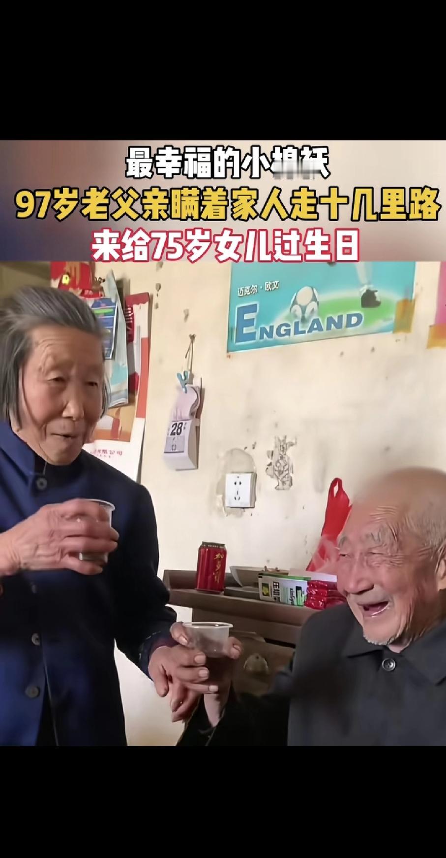 75岁女儿过生日,97岁的老父亲瞒着家人走了十几里路去给女儿庆生。 这画面太暖心了!老父亲虽然自己需要拄拐杖缓慢出行,却始终记挂着女儿的生日。 网友纷纷感动:“不管多大,在爸爸心里永远都是孩子!”这份跨越世纪的父爱,比任何礼物都珍贵。真是最幸福的“小棉袄”,最温暖的生日祝福!