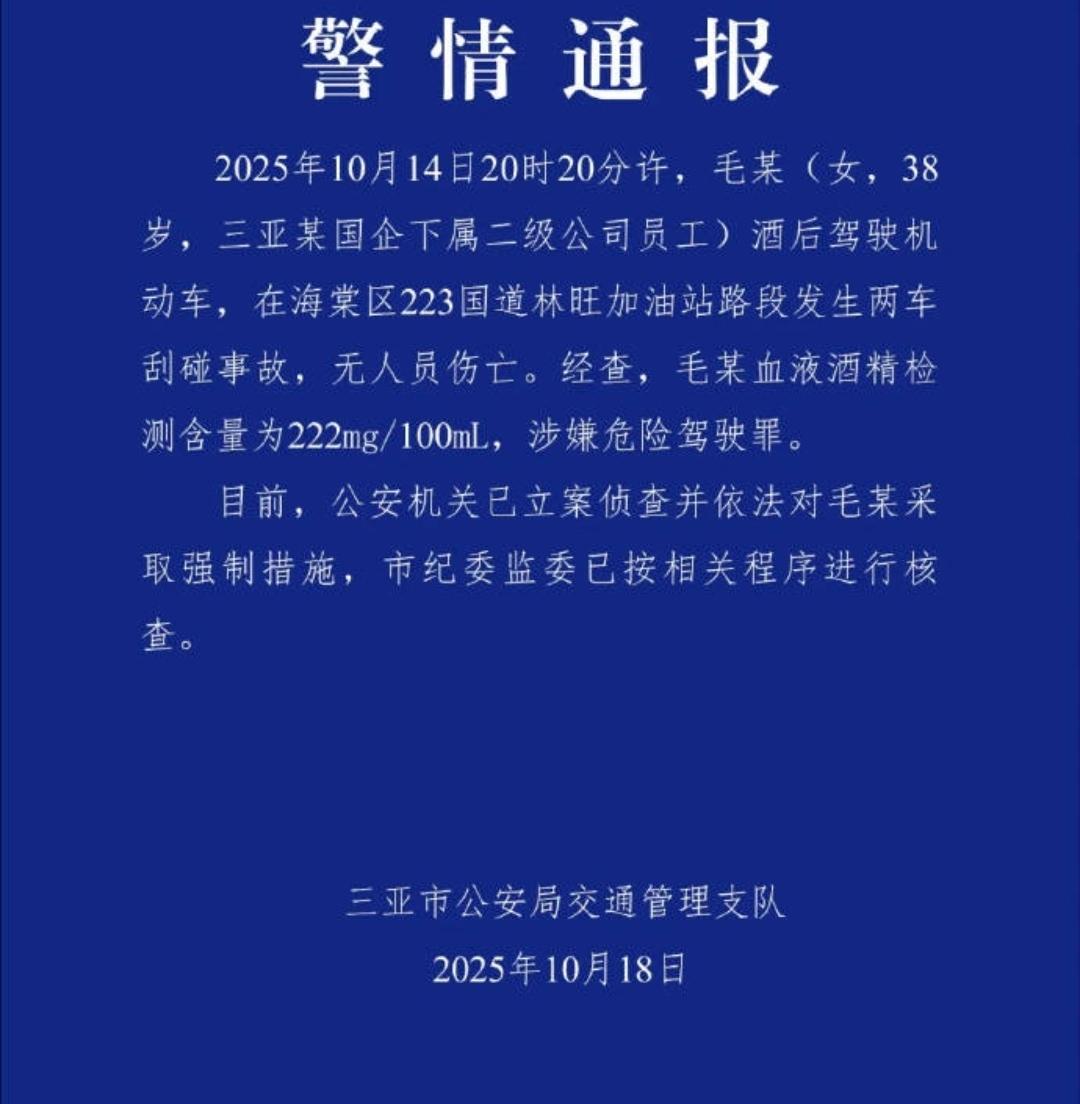 求锤得锤! 女子酒后驾车,撞了劳斯莱斯后,扬言自己反正是国企员工,让市委市政府通报自己…… 结果,您猜怎么着,果然通报就来了。 38岁的毛女士,是三亚国企的公司员工,酒后驾驶车辆发生车祸,涉嫌危险驾驶 目前毛女士已经被采取强制措施。 所以你看,有时候你别狂,国企怎么了,互联网一闹大,谁也保不了你!