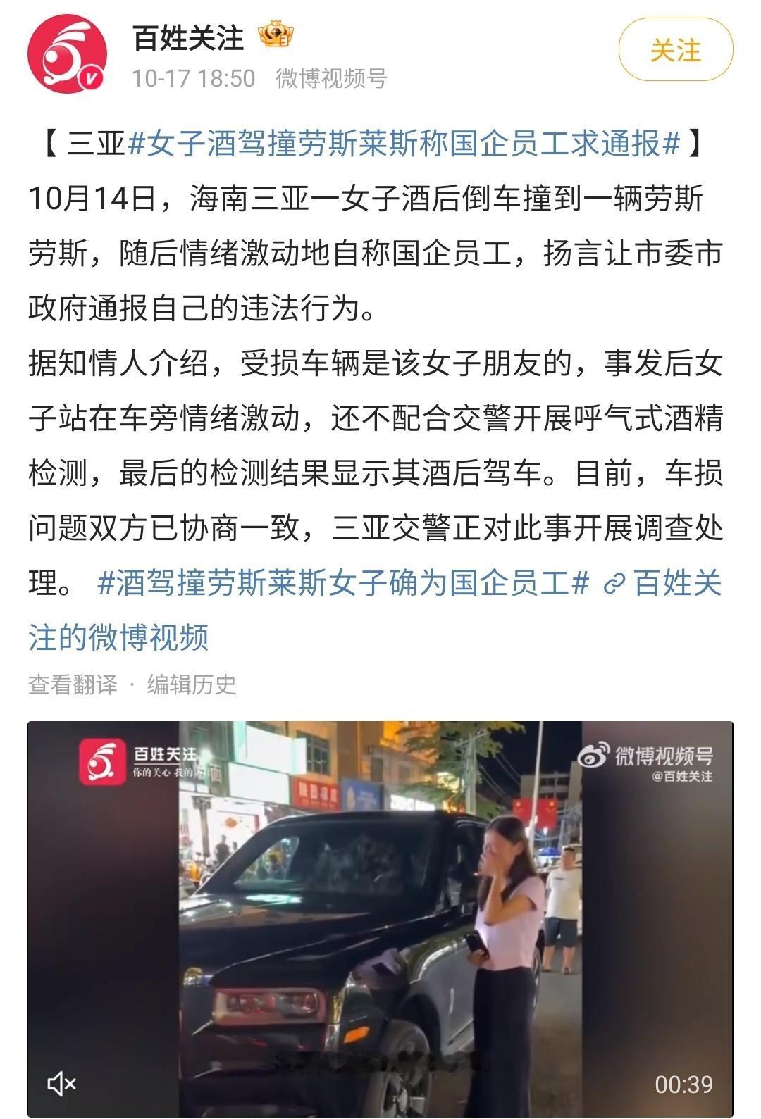 求锤得锤! 女子酒后驾车,撞了劳斯莱斯后,扬言自己反正是国企员工,让市委市政府通