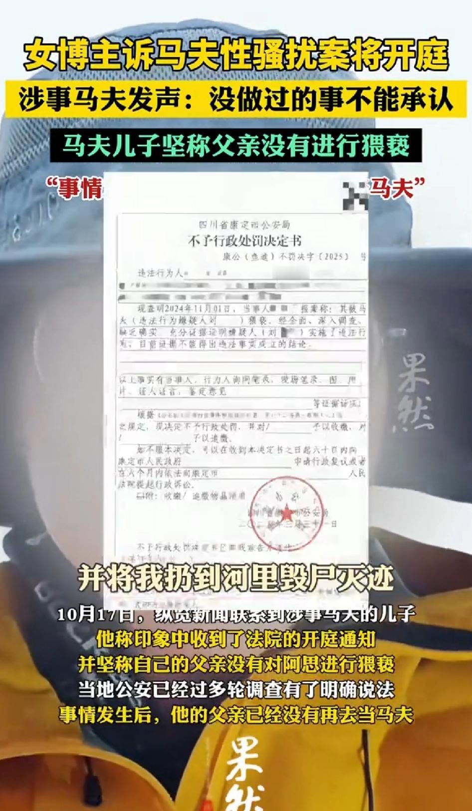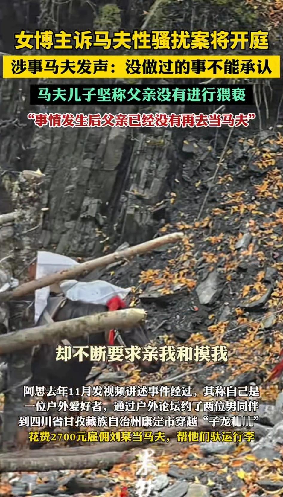 女博主诉马夫性骚扰案将开庭,涉事马夫发声:没做过的事情不能承认。 这事儿从2024年10月底就开始闹得沸沸扬扬。女博主阿思称穿越“子龙秘境”时,花费2700元雇佣刘某当马夫,帮他们驮运东西! 马夫第二天就有过界举动,第四天还实施了猥亵。 她报警后因证据难寻陷入僵局。马夫儿子说警方认定父亲无猥亵行为,马夫起诉阿思诽谤还败诉了。 当时因取证困难,双方都没胜诉。 马夫起诉女博主诽谤自己败诉了。 女博主在视频里讲的有鼻子有眼,把当时的过程诉说的很详细。 涉事马夫的儿子他称印象里收到过法院的开庭通知。并坚称自己的父亲并没有对女博主阿思进行猥亵。 当地公安已经过多轮调查有了明确说法,事发后,他的父亲已经没有再当马夫了! 如今这案子又要开庭,到底真相如何,是女博主真遭遇不幸,还是另有隐情? 不管双方到底是谁再说谎,一定要查清楚,还受害人一个公道。 现在就等法院给出公正的结果了!