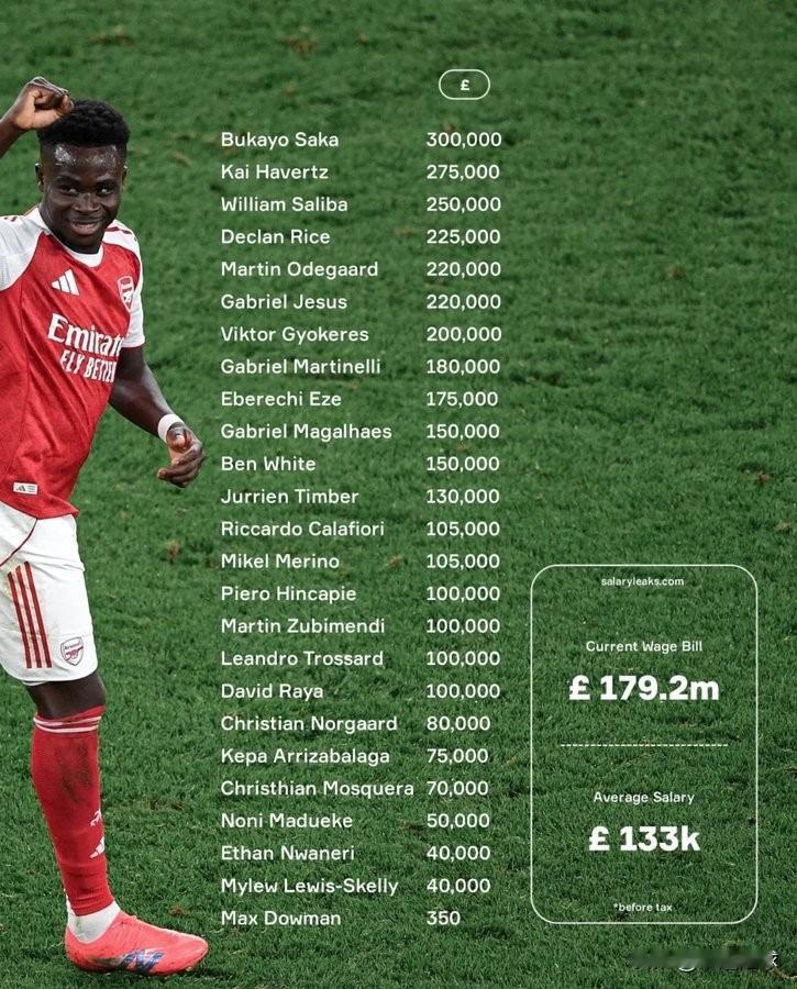图片展示阿森纳俱乐部的薪资情况。 列表包括了25名球员,从顶薪的萨卡(30万英镑)到最低薪的道曼(350英镑)。 🔝 顶薪球员(前六名) 1. 萨卡 – £300,000 2. 哈弗茨– £275,000 3. 萨利巴– £250,000 4. 赖斯 – £225,000 5. 厄德高 – £220,000 6. 热苏斯 – £220,000 列表显示阿森纳的薪资分布较广,顶薪球员与底薪球员差距巨大(最高30万英镑 vs 最低350英镑),这反映了足球俱乐部中球星与角色球员的常见薪资差异。而总工资支出接近 1.8 亿英镑,平均周薪为 13.3 万英镑,显示出顶级俱乐部在球员薪资上的巨大投入。