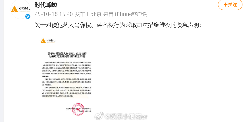 时代峰峻紧急声明时代峰峻对侵犯艺人肖像权姓名权行为维权↓