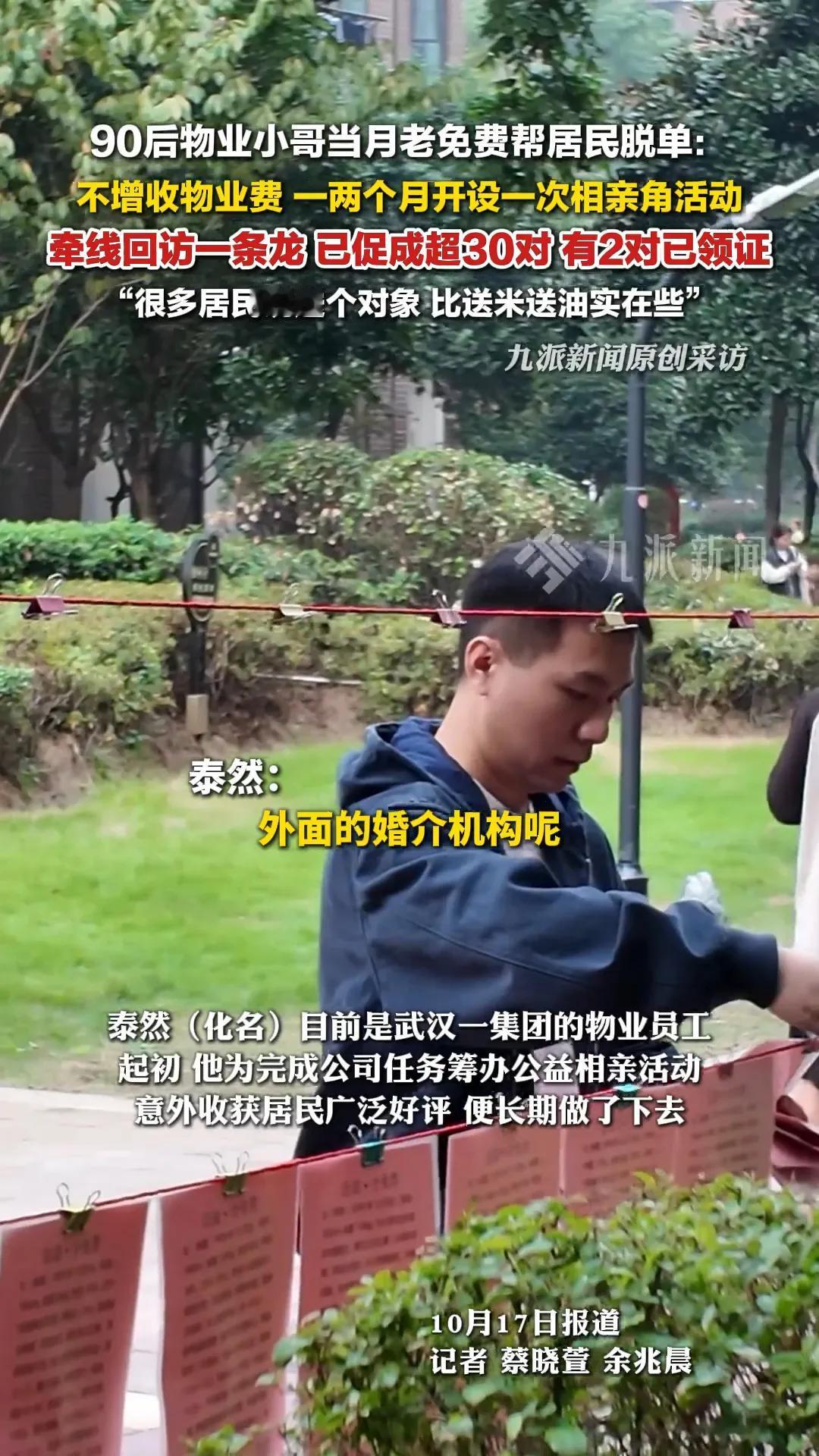 操碎了心!90后物业小哥化身月老为居民脱单:不多收物业费,平均一个月开设一次相亲角活动。小区居民:送个对象比送米送油实在多了! 这事儿还得从去年说起,当时公司让他办个七夕联谊活动,本来只是完成工作任务,没想到活动结束后,参与的人都舍不得走,站在路边聊得热火朝天。 这一下就点燃了小伙做红娘的热情,从此在"月老"的路上一发不可收拾。 现在他可专业了!自制相亲信息表,按区域建交友群。每周定时在群里发布资料,光是收集到的相亲信息就有1000多份。更暖心的是,他还会跟踪回访,要是双方觉得不合适,他还会帮忙分析原因! "最开始好多人都怀疑我是骗子,来了四五次才相信我真不收钱。"小伙笑着说。最让他自豪的是,已经有两对新人步入了婚姻殿堂,他还参加了其中一对的接亲呢! 如今在小区里,小伙可是个红人。阿姨们见了他就拉着问:最近有没有适合我闺女的?"年轻业主们也乐意找他帮忙,都说这比送米送油实在多了! "既能帮邻居们解决终身大事,又能提升物业服务满意度,这是双赢啊!"小伙表示会一直做下去,让更多有缘人在小区里相遇。 我觉得吧这事儿最打动人的是,一个普通物业小哥,用一根红线就把咱们习以为常的“冷漠小区”变成了温情脉脉的“熟人社区”。 现在年轻人工作忙、圈子窄,连对门邻居都不认识,他却巧妙地把找对象这个刚需变成了打破邻里隔阂的突破口。这不只是牵线搭桥,更是把冷冰冰的小区重新变回了有人情味的大家庭! 更让人感叹的是,他让物业从“催费查岗”的变成了“操心终身大事”的红娘。当服务做到了心坎上,信任自然就来了!