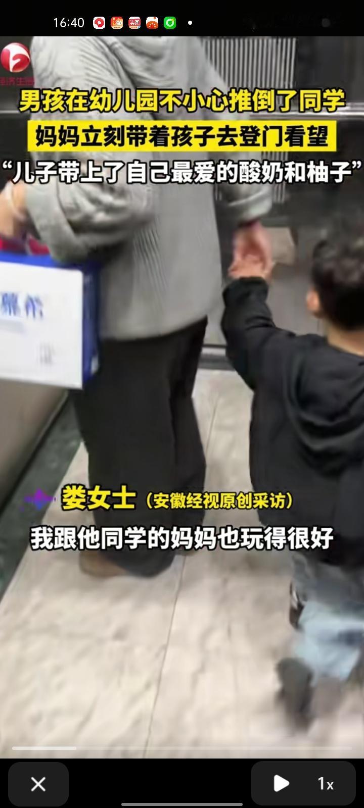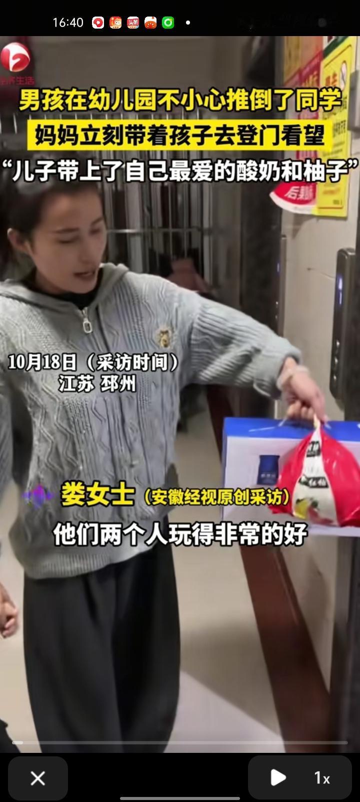 10月16日,徐州邳州市。孩子妈妈发视频表示,儿子和同学在学校玩的时候,不慎把同学推倒,其后背有点磕破。晚上放学后,儿子提上他喜欢的酸奶和柚子去同学家拜访。不管严不严重,都要去看一下。
