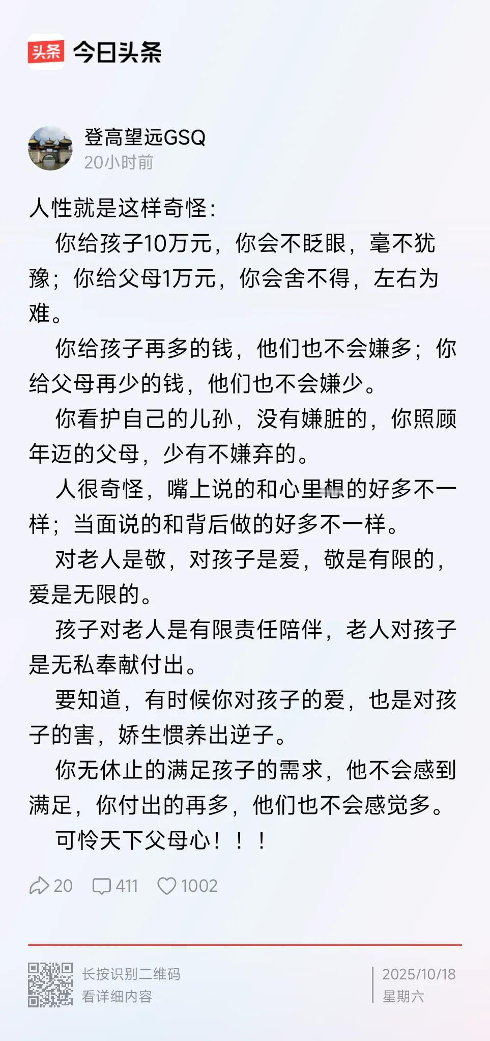 这篇文章反映了一个不可否认的事实和现象。 中国人的传统一般都是往下亲,在现在的时代,这种观念被强化了。 如果父母没有退休金,也没有自己的积蓄,这种观念会更明显。 但不是绝对,这也和人品有关。 大家怎么看?