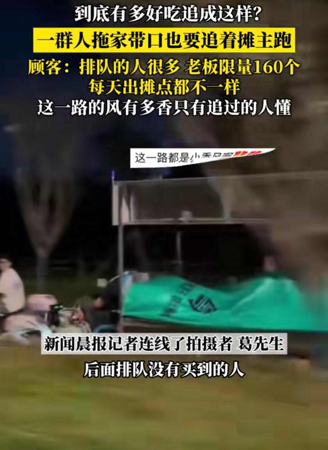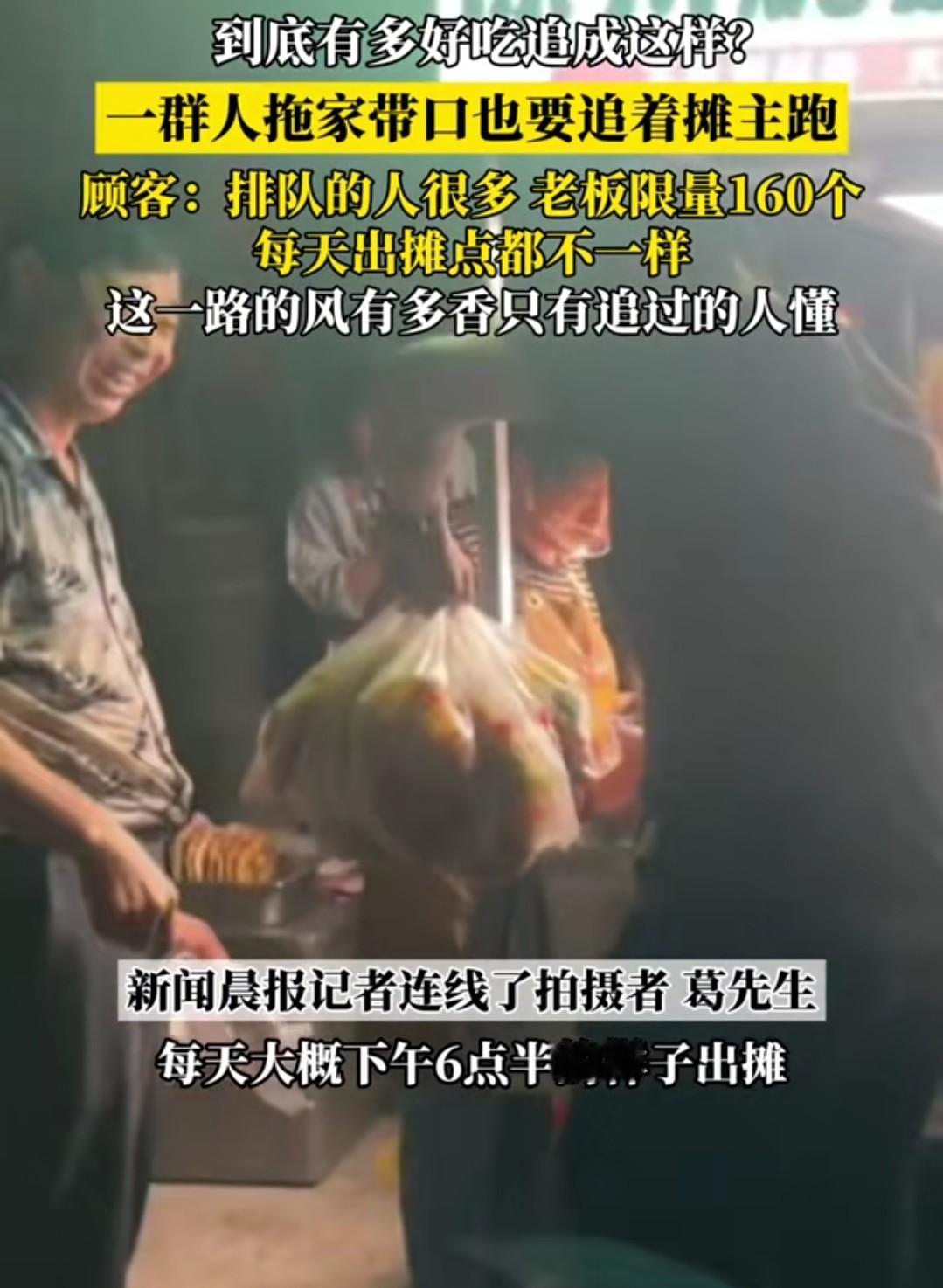 这得有多好吃才会这样?一群人追着摊主跑,像是某些小说情节照进现实。 最近,有位博主发了个视频,说的是他们一群人追着摊主跑,就为了那一口吃的。 据说这个摊主每天下午六点准时出摊,每天出摊的地点不一样,摊主会在微信群里通知,摊主每天限量只做160份,每人限量两份,卖完即止。 这次被人追着跑是因为摊主临时要改地点,排队的人很多,不少人为了这一口吃的,拼命追赶摊主。