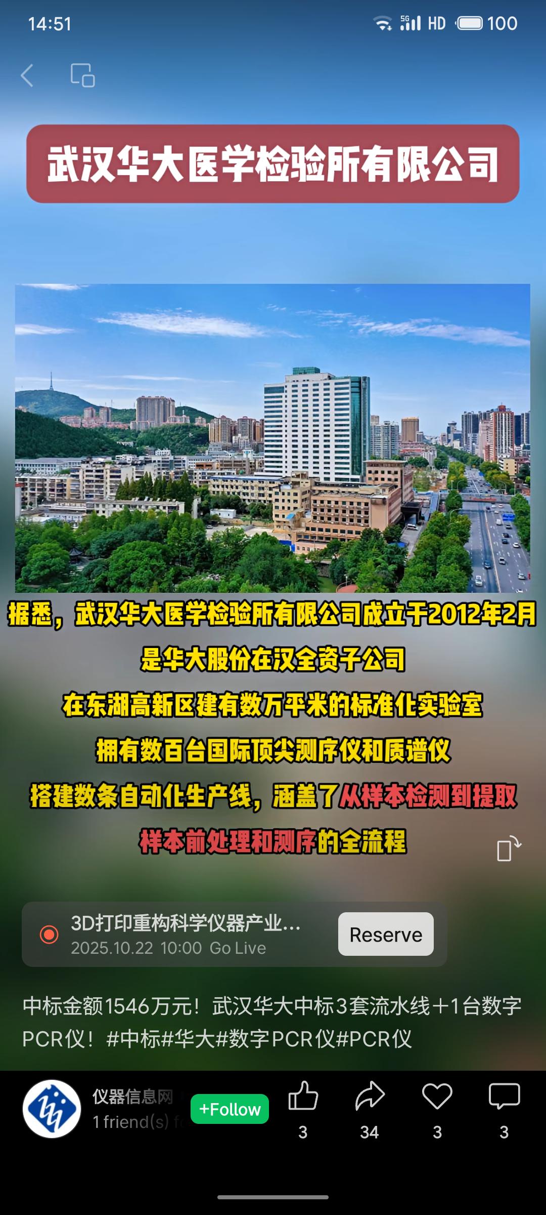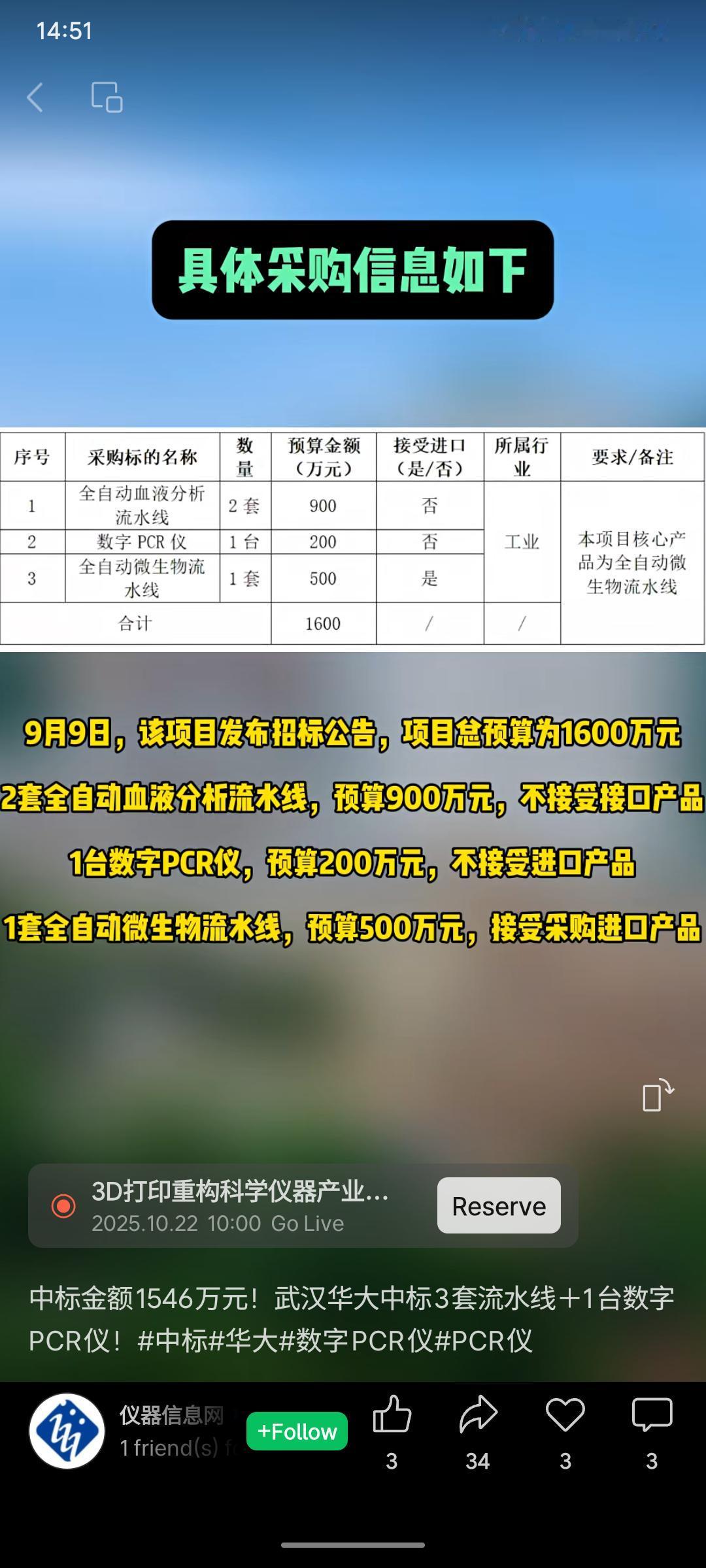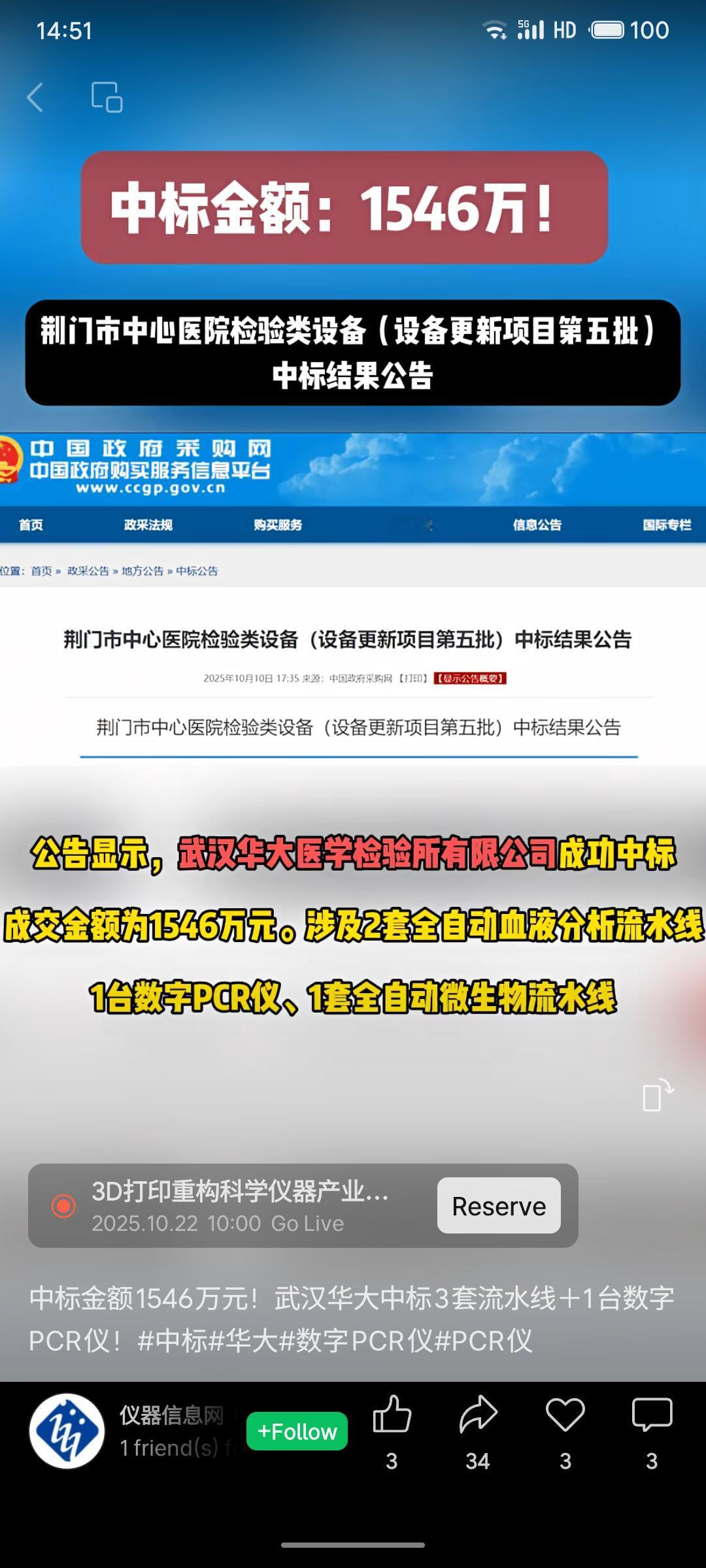武汉华大医学检验所有限公司以1546万元中标荆门市中心医院检验设备更新项目,采购内容包括2套全自动血液分析流水线、1台数字PCR仪及1套全自动微生物流水线。项目总预算1600万元,实际成交节省54万元,其中微生物流水线允许采购进口产品。此次中标体现了华大在医疗检验设备领域的综合实力。