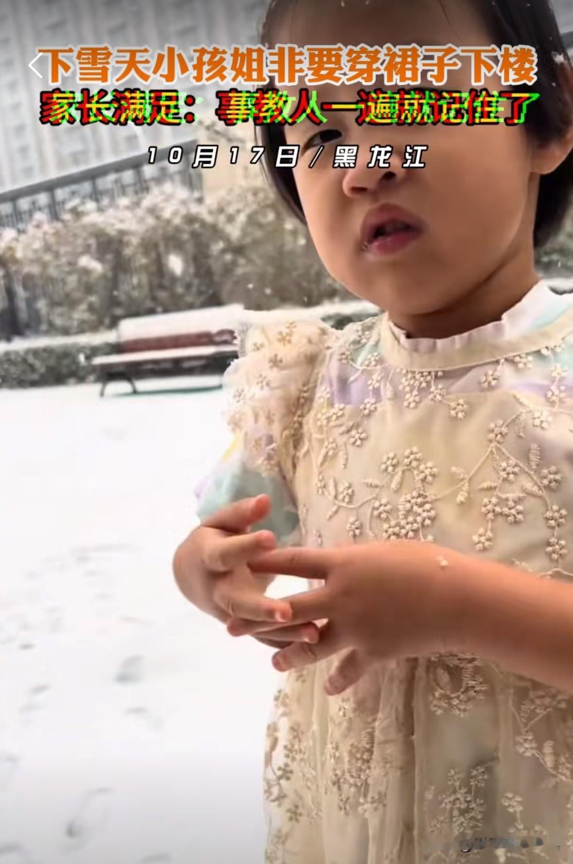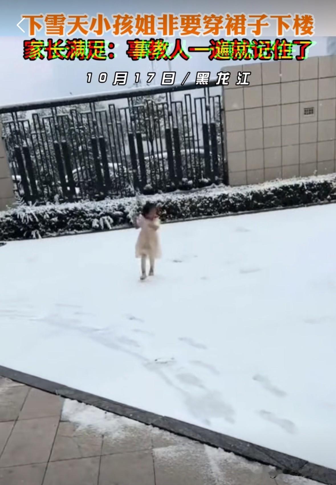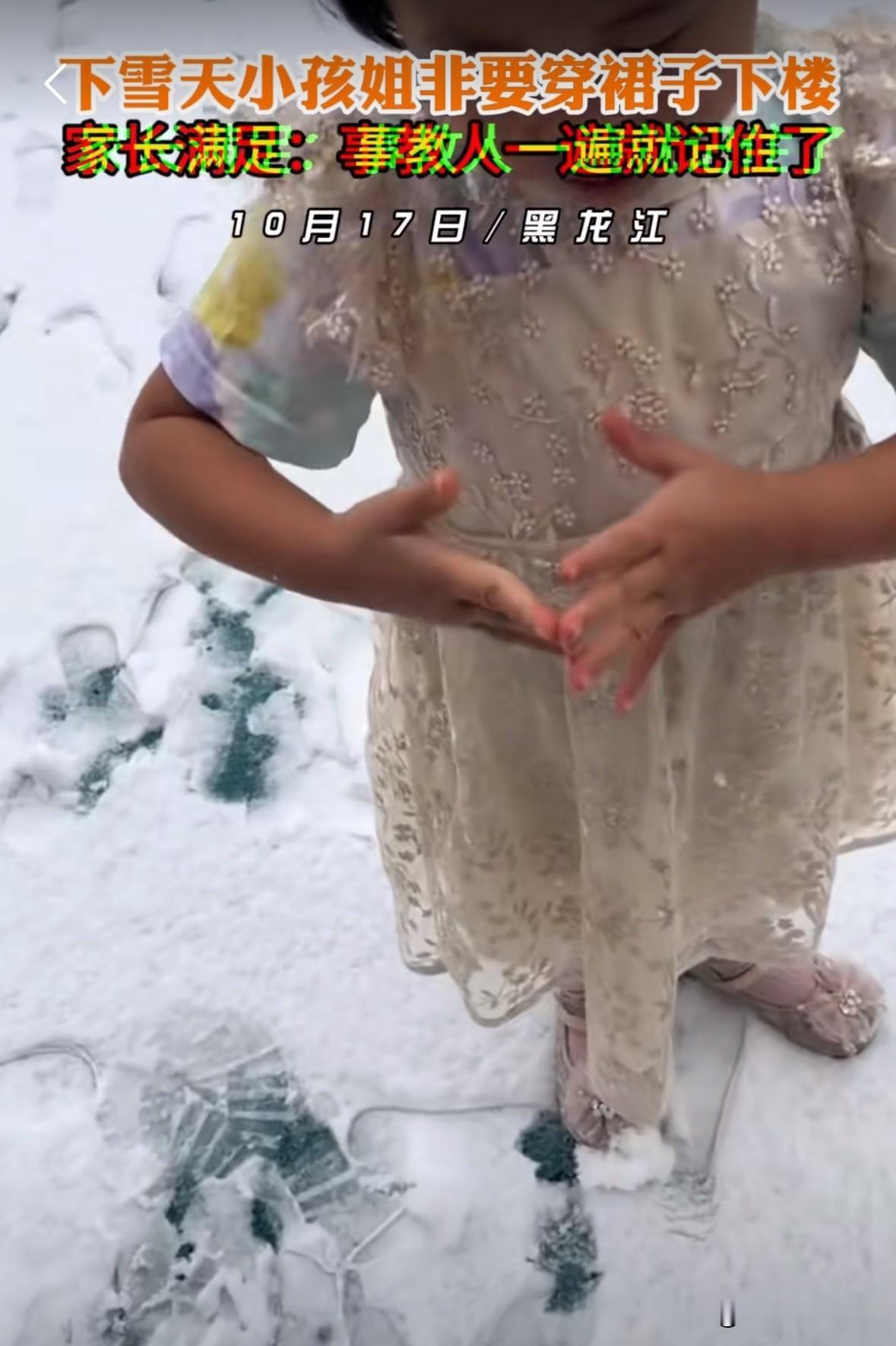 黑龙江一个小女孩,下雪天非得要穿裙子下楼玩,妈妈怎么劝导都没用,只好给她穿上裙子下楼玩。 下楼前妈妈给小女孩说:“玩够一小时才能上来!” 小女孩很开心! 下楼后,小女孩在雪地里跑了一圈,被冻的瑟瑟发抖,就告诉妈妈:“我冷。” 妈妈说:“我是不是早就告诉你了,外边冷!” 事后妈妈说:事教人一遍就能记住。 这次我支持妈妈的做法,有的小朋友真的怎么说都不听,让她亲身体验过才知道! 我相信女孩再也不会大冷天想穿裙子了