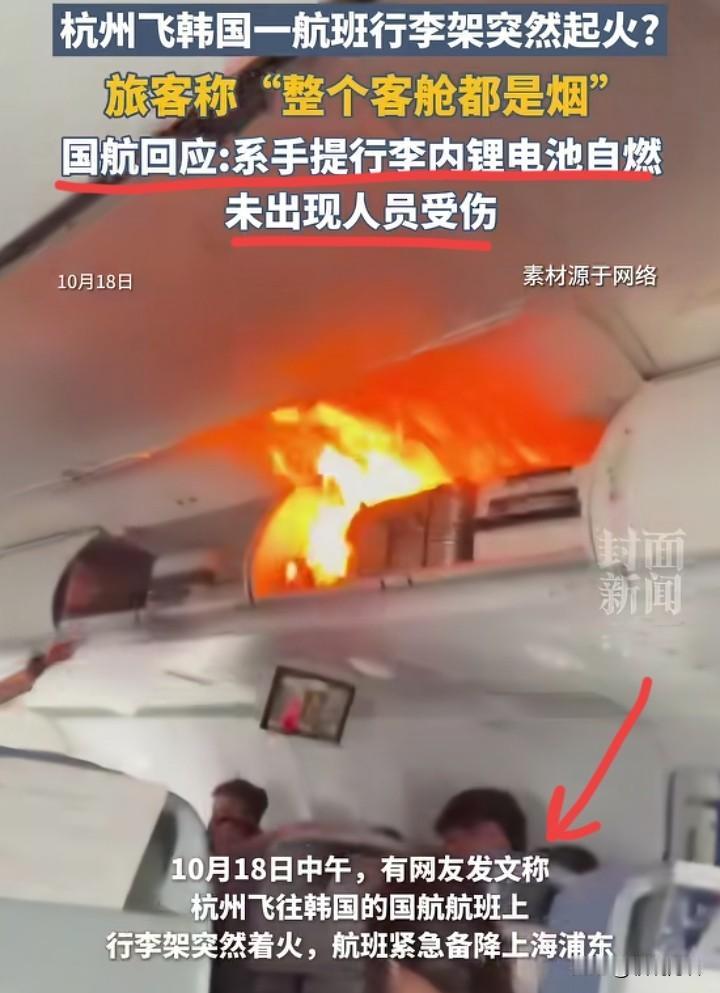 航班着火, 行李架上一旅客的行李起火,火势不算大,但底下的乘客就慌了,生怕一不小心就爆炸,着急地喊用灭火器灭火。 最后官方给出是锂电池自燃,无人员受伤。有人说手机电脑都会有锂电池,不一定是充电宝。大家都知道充电宝是要求3c才能登机,充电宝登机是很严的。