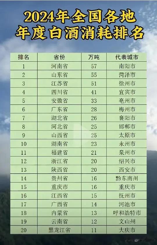 真是小看了河南,全国白酒消耗大省,河南第一,山东第二,江苏第三! 东北虎,西南狼,喝不过江苏的小绵羊,一点不假! 都说内蒙和东北能喝,看白酒消耗排名,头十名都没进去!