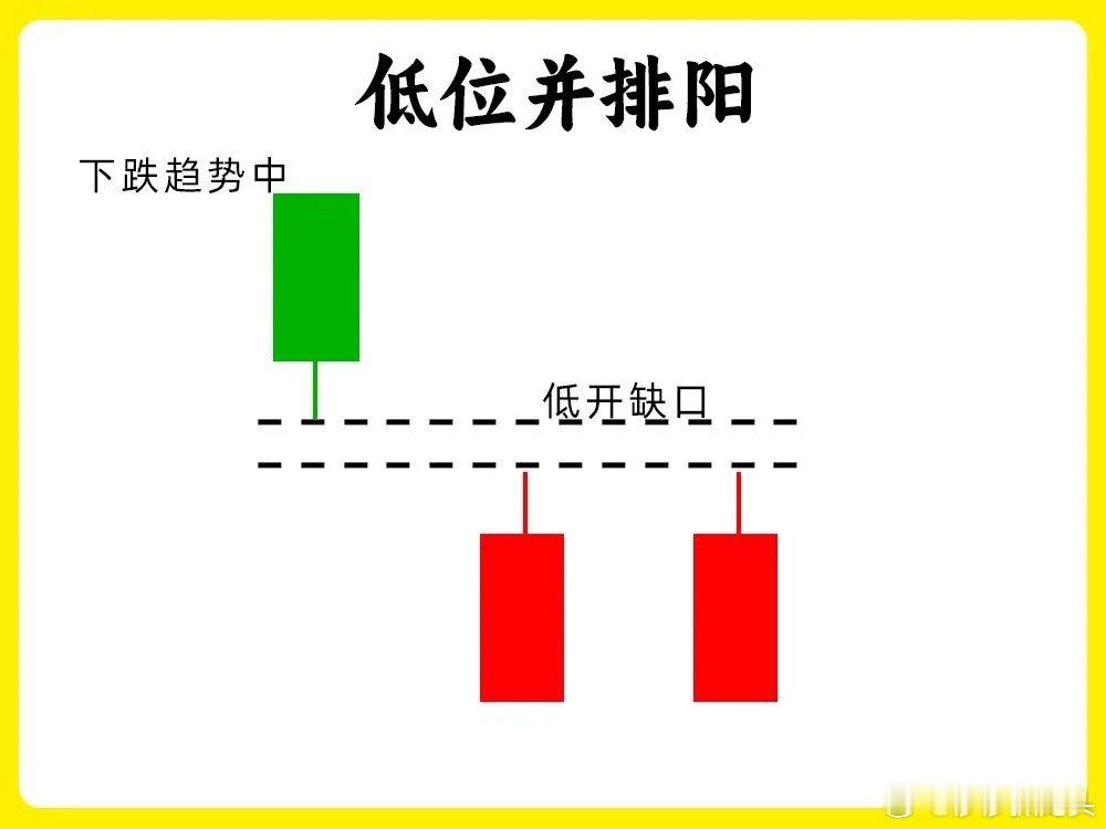 下跌末期先出一根中大阴线,释放大量抛压;次日起连续两天低开高走,收出两根大小相近的阳线,且留有低开缺口,标志多方开始发力,股价逐步企稳。