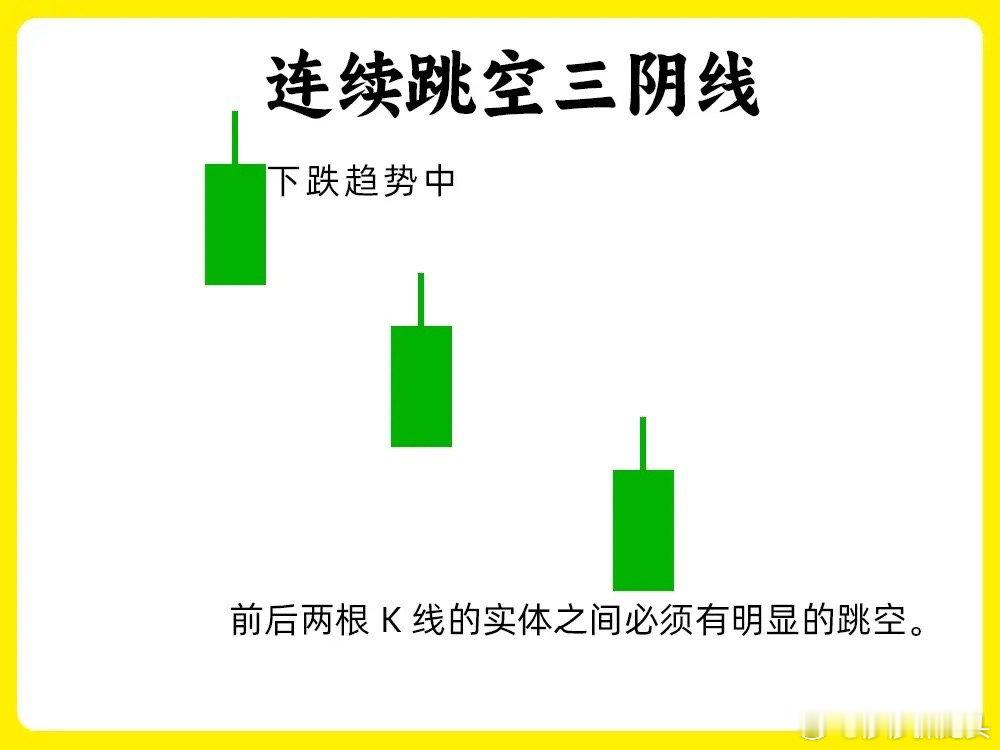 下跌过程中连续三根跳空低开的阴线,每根都留有缺口(有无上下影线均可)。看似抛压沉重,实则缺口位置是关键支撑位,后续若出现企稳信号,反转概率较大。