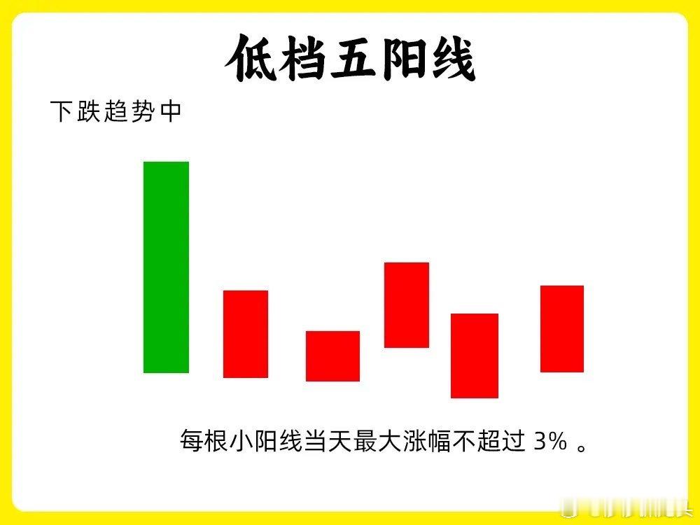 下跌中先出现1-2根中大阴线,随后接连收出5根以上小阳线,阳线振幅多控制在3%左右,横向震荡不创新低,阳线数量越多,说明多方力量越强,常见于低位或上涨初期。