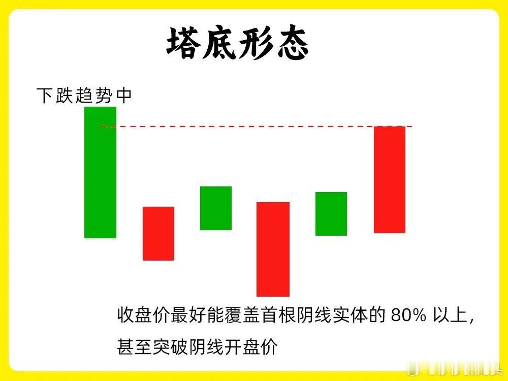 下跌末期先出一根中大阴线作为参照,随后股价进入10个交易日内的横盘期,小阴小阳均在这根大阴线范围内波动,多空暂时平衡;当出现一根放量阳线,且接近大阴线最高价时,塔底形态形成。