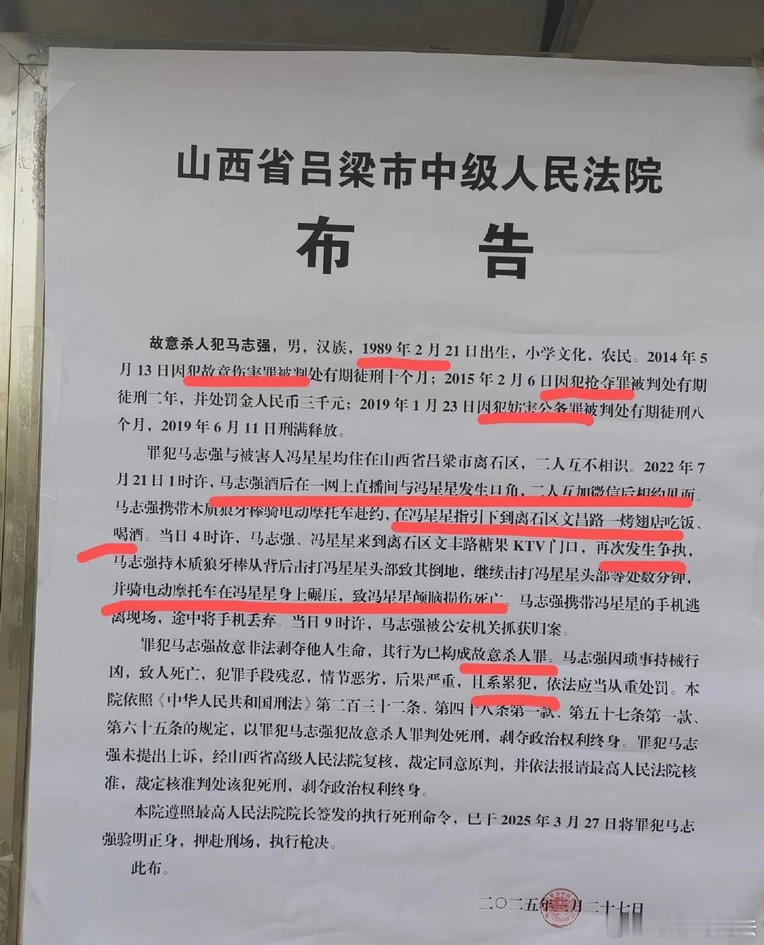 这就是天生的人渣,山西吕梁马志强监狱的常客,1989年生,小学学渣。 至从2014年第一次因为故意伤害罪入狱判处10个月; 2015年抢夺罪判处2年; 2019年妨害公务罪判处8个月; 2022年,和一男子冯星星网络上发生口角,线下约见面,持狼牙棒击打被害人头部,摩托车碾压,导致被害人死亡。 2025年3月被判处死刑。