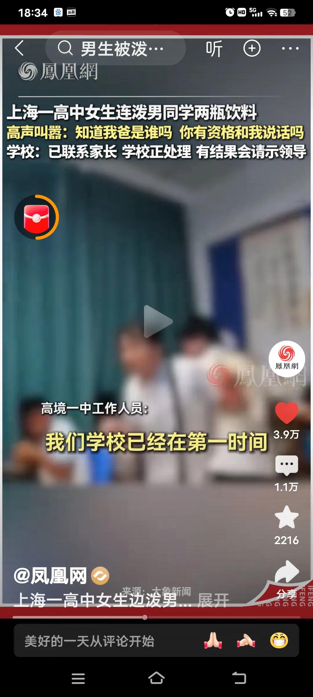 近日,网上流传的一段视频,着实令人火冒三丈。上海高境一中一女生,接连朝男同学泼了两瓶饮料。男生老实本分,没什么反应,想来是不想惹事。 可这女生倒好,愈发嚣张,竟嘲讽男生成绩不如自己,将分数看得高于一切。她的分数比男生高30分,便说男生高考后面得加个零,还称像那样的大专中专生没资格跟她说话? 她还质问男生知不知道她爸是干什么的。男生终于忍无可忍,反击并抱住了她。这时,两名戴眼镜的男同学出来制止男生,却对女生此前的行为不闻不问,明显是看人下菜碟。此事反映出家庭教育以及学校重应试、轻素质教育的问题,确实值得好好反思。 高境一中工作人员表示:学校已第一时间处理此事,后续也会请示领导,将处理结果向社会作出交待!