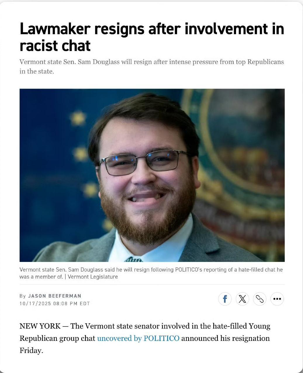 此前美国媒体报道了共和党人在群聊中发表种族主义言论,引起不小的异议,随着事件发酵,佛蒙特州共和党参议员萨姆·道格拉斯周五宣布辞职。我当时听到万斯为涉事的共和党人辩解时,称发表这些言论的人是“孩子”,感觉特别好笑,不知道美国对孩子的定义是三十岁还是四十岁。道格拉斯本人当时在群聊里面评价自己的前女友、一名印度胖姑娘,说“她只是不经常洗澡”,这话比起群聊的其他内容,杀伤力低得多。现在道格拉斯站出来承担“成年人”责任而辞职,其他“小孩”安然无恙,他们可以以“小孩”的身份继续口嗨。
