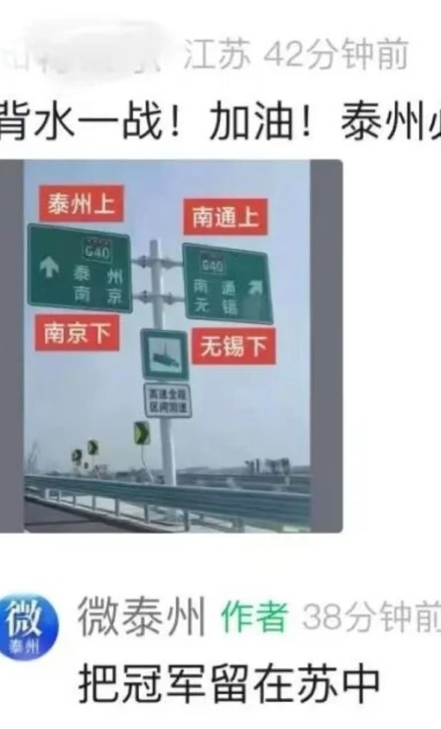 泰州9:8点球决胜负击败南京队,尽显黑马本色。赛前,又有多少球迷会觉得泰州能打进决赛呢? 此前,网上有流出一张高速上的照片,照片显示:泰州、南通在上面,南京和无锡在下面。这是不是冥冥中就有暗示,冠军会在泰州和南通当中产生。 有球迷表示:十三太保里面,只有泰州和南通旅游业最差,啥好玩的都没有,就让它们赢一次吧。 [我想静静][我想静静][我想静静],这话总让人感觉有一种酸葡萄心理在里面!
