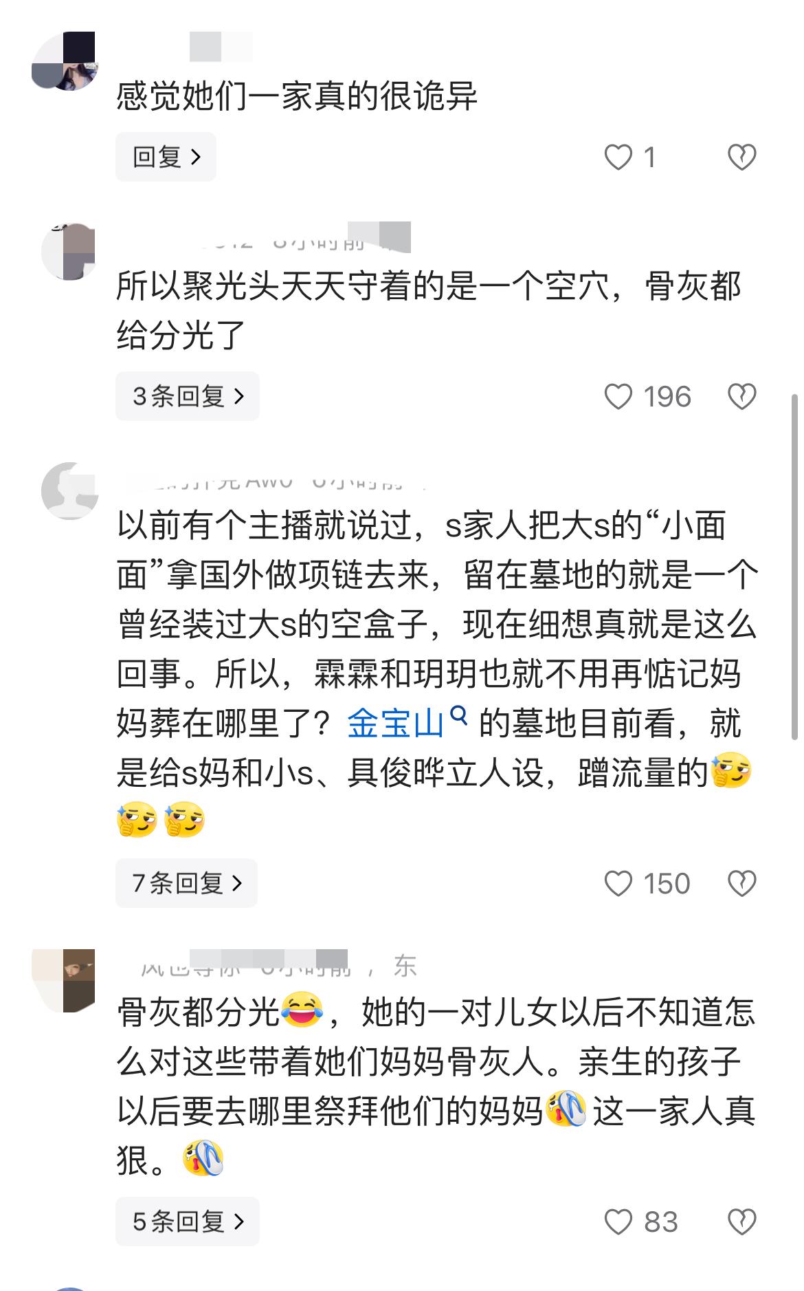 S家的操作总是让人大开眼界! 小S这次又爆料了,说她戴的坠子是姐姐大S的骨灰做的。 具俊晔一共设计了七条项链,具俊晔亲自画稿,七条项链送给S姐妹团一人一条。看到这里,很多人可能会觉得太震惊了。听到后面的一些细节,我觉得这件事情有点可怕。具俊晔说,这个坠子可以帮助大S保平安,可是孩子们没有地方祭母亲,她家居然把大S的骨灰平分了。S妈是怎么同意的? 这是什么操作呢?大S的骨灰做成坠子戴着,是不是意味着大S的骨灰不值一提! 网友说:不让孩子去葬礼,然后把人家母亲骨灰分给毫无血缘不相干的人,都没想过孩子。还在公开场合侃侃而谈。不怕孩子长大恨死他们!