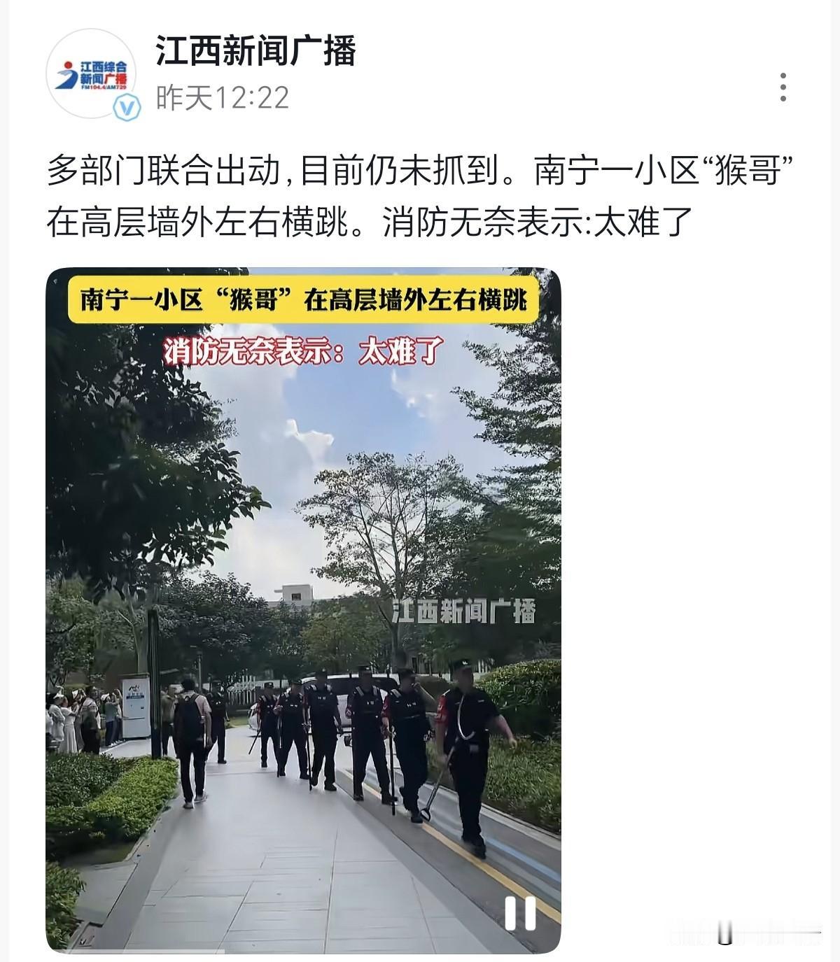 这几天,在广西南宁,有一只调皮的猴子,闯入小区。在高楼外墙上来回穿梭,牵动了该小