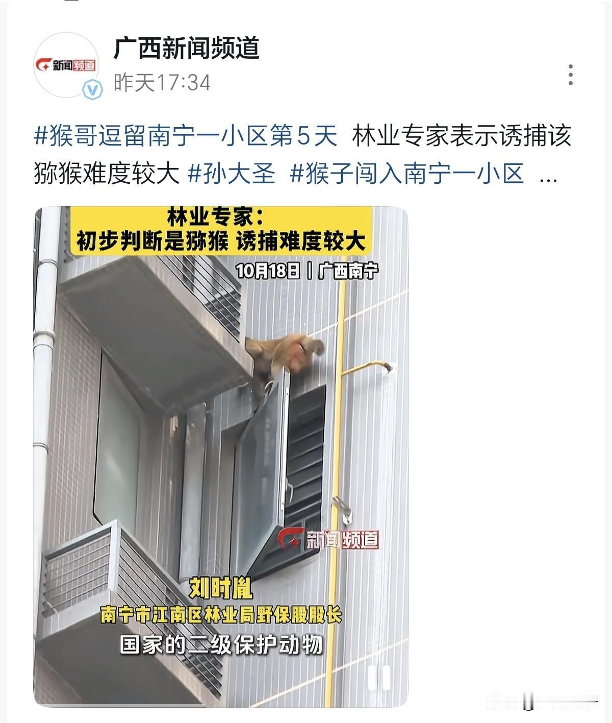 这几天,在广西南宁,有一只调皮的猴子,闯入小区。在高楼外墙上来回穿梭,牵动了该小区居民,广大网友,以及各大新闻媒体的心。就连央视新闻和人民日报都报道了。 据媒体报道,当地相关部门和小区物业,都在联合想办法。但是由于楼层太高,猴子太活跃,跳来跳去的,一时之间,也很难抓住它。 林业专家表示,初步判断这是一只猕猴,诱捕难度很大。只能说,小区里闯入了齐天大圣,这只小猴子确实挺闹腾的。