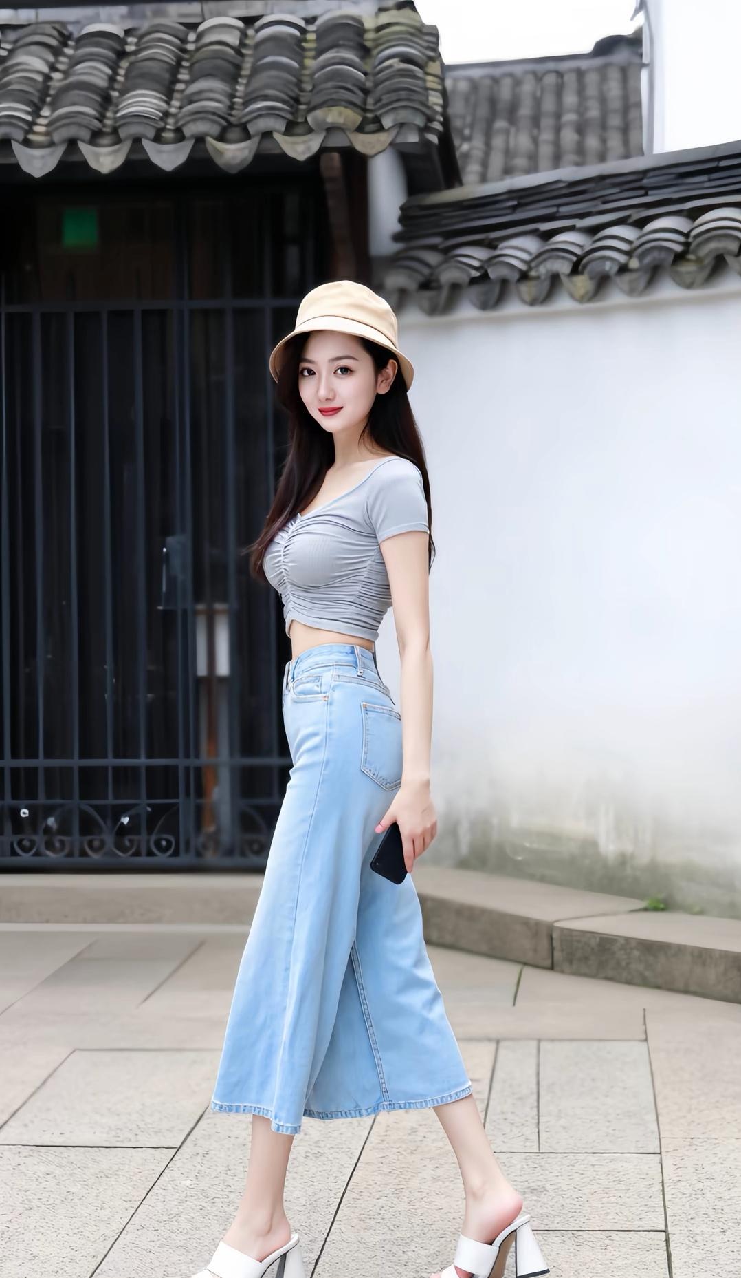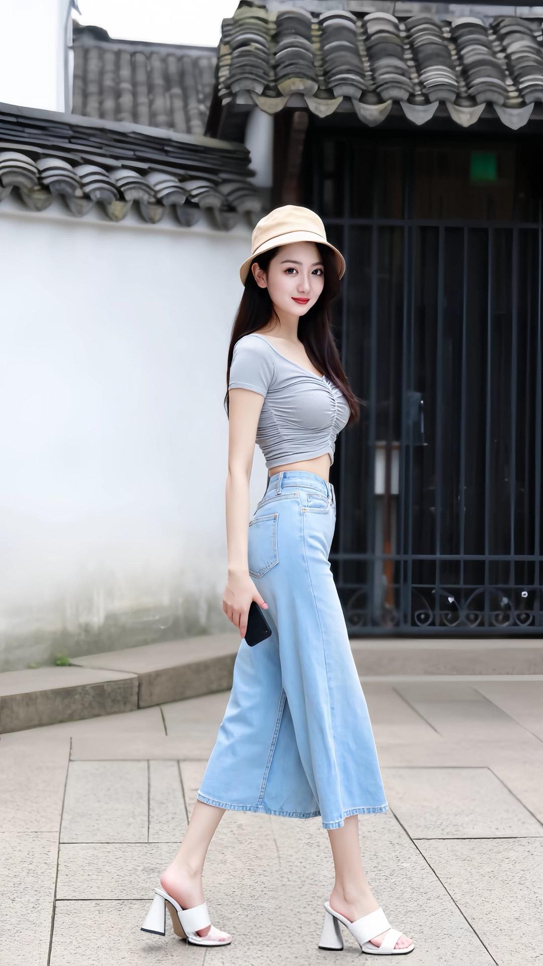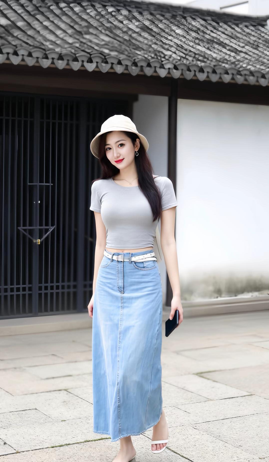 清新夏日穿搭,牛仔裙搭配灰色T恤,轻松自在!