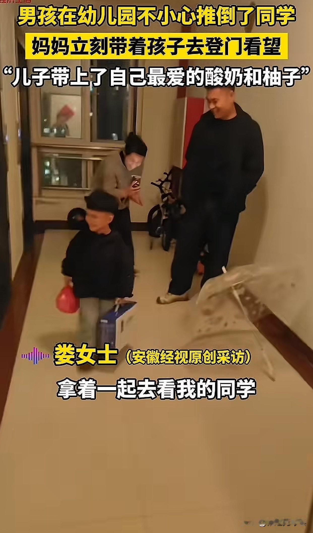 江苏有个小男孩在幼儿园不小心把同学碰倒了,他妈妈知道后,马上带着他去同学家看望。让我觉得特别暖心的是,这孩子不光听妈妈的话,还主动要带上自己最爱喝的酸奶和家里的柚子,真心想跟好朋友分享。 说实话,这孩子真不是随便应付妈妈,而是打心眼里想把最好的东西带给朋友。两位妈妈本来就认识,所以处理这件事时气氛特别好,完全没有互相责怪的意思。 我觉得这样明事理的家长,带出来的孩子情商肯定不会差!小孩子其实最会看样学样,妈妈用行动教他承担责任和传递善意,比讲大道理管用多了。孩子主动分享自己最喜欢的东西,这正是小朋友之间建立友谊最纯粹的方式。 说到底,最好的家教,就是让孩子在温暖中学会爱与责任。