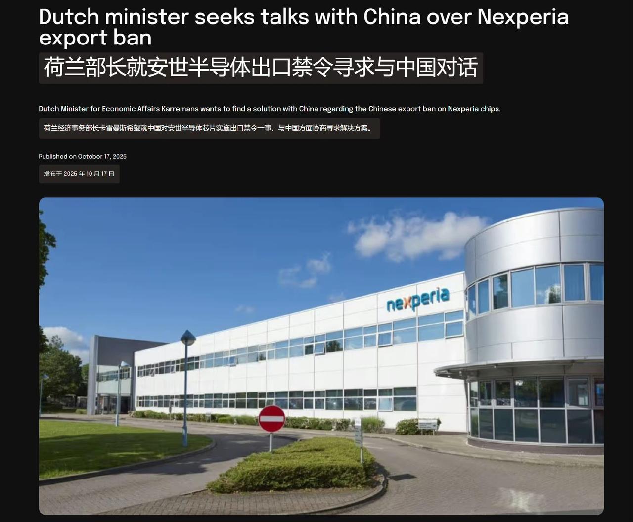 荷兰冻结安世半导体资产后,中国禁止出口安世中国生产的部件和组件。这就意味着荷兰安