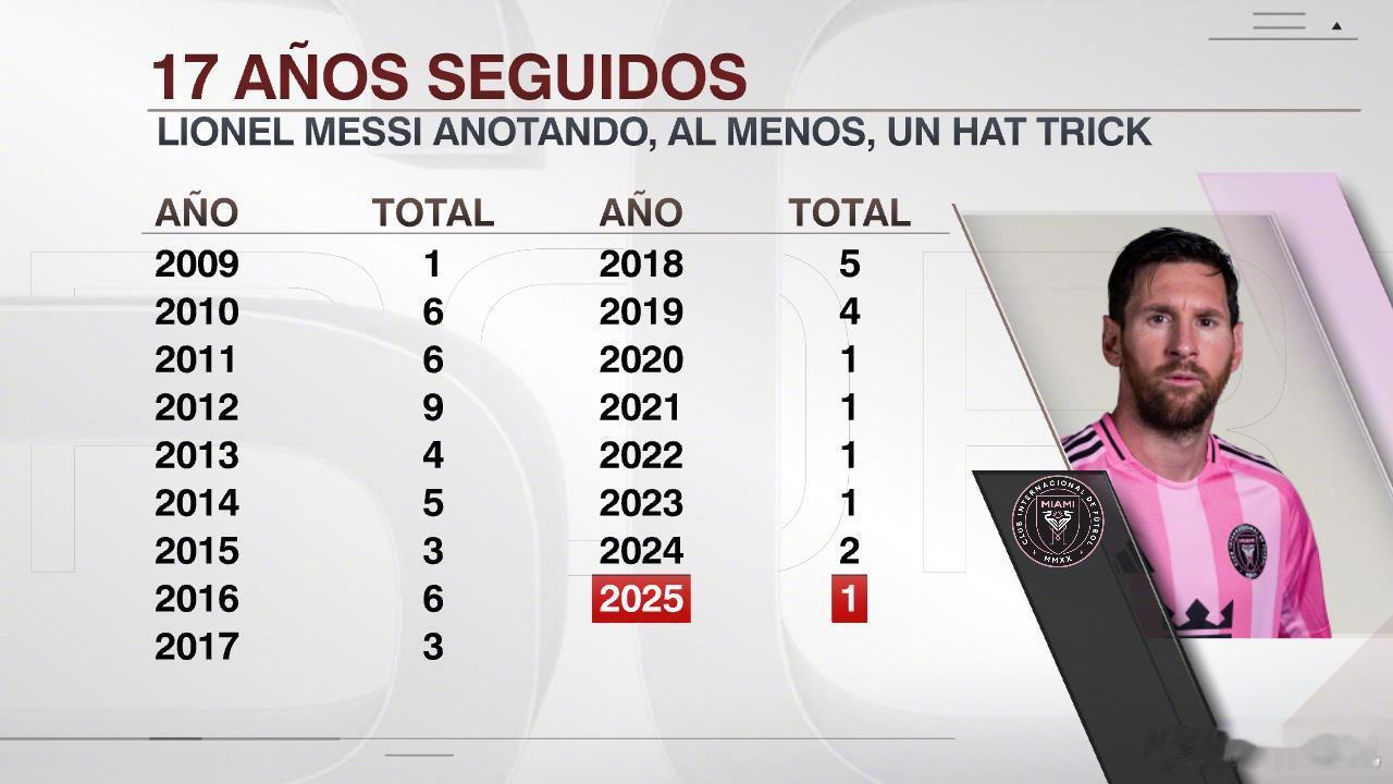 怪不得梅西今天没有让点,原来是要创造连续17年上演帽子戏法的记录!在今天迈阿