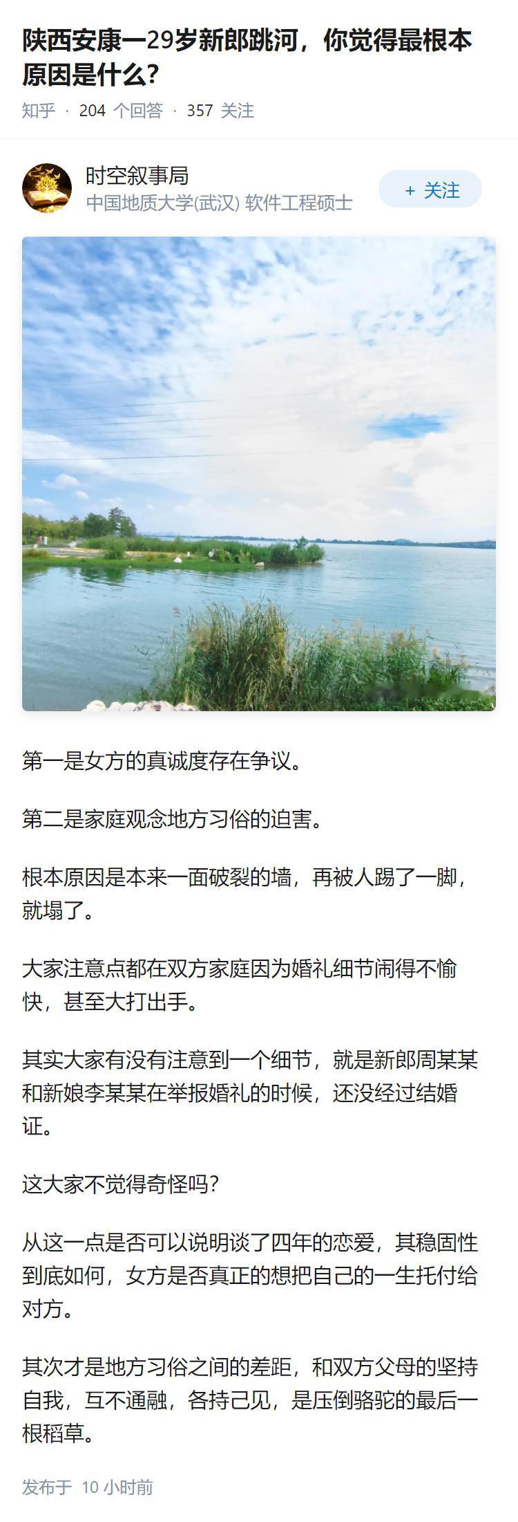 陕西安康一29岁新郎跳河,你觉得最根本原因是什么?