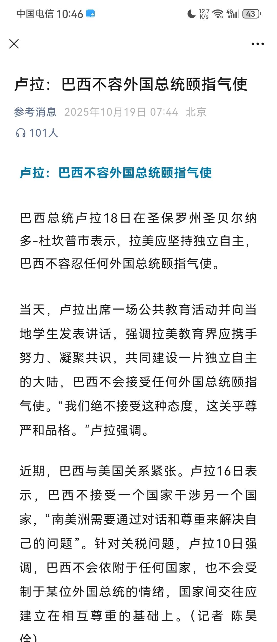 巴西总统卢拉面对美国时,越来越有底气与自信了。根据参考消息10月19日报道,卢拉近日在一次讲话中,针对特朗普,竟然毫不客气说道:“巴西不会接受任何外国总统颐指气使,我们绝不接受这种态度,这关乎尊严和品格。” 这样强硬的言论其实令人十分吃惊,要知道美国在拉丁美洲的影响力很大,动辄就可以左右一个国家的政局,如果一个拉丁美洲的国家总统对美国有敌意,可能要不了多久这个总统就会被推翻下台,但是卢拉明明知道这一点,面对特朗普的盛气凌人,却没有任何奴颜婢膝,反而自信飞扬,保持着强势的态度。 而之所以如此,本质上其实不是因为卢拉个人的勇气,而是整个国际大势在无声无息之间的变化,以往美国之所以能够对拉丁美洲有那么巨大的影响力,很重要的一个原因就是在经济上,拉丁美洲对美国的依赖程度很深,拉美各国很多关键产业都掌握在美国手中,历史上著名的“香蕉共和国”是一个最典型的例子。 经济是一切的基础,关系到国计民生,美国握住了这一条命脉,自然使得拉美各国只能屈服于它的淫威之下。 现在情况则不同了,随着我们推动“一带一路”的发展,与世界各国的联系不断加深,现在拉丁美洲各个国家国内很多产业,都渐渐摆脱了美国的控制,走上了独立自主的道路。 这一点从经济数据上就可以看出来,2024年,巴西对外贸易总额为5995亿美元,其中与中国的双边贸易总额就达到了1881.17亿美元,中国更是连续16年成为巴西最大的贸易伙伴。与此对比,巴西与美国的贸易总额就只有827.424亿美元,而且同比还下降了27.18%,也就是说,巴西对美国的依赖已经越来越少。 更加重要的是,与美国合作,基本上美国是不会帮助合作国家进行产业升级的,反而会想方设法打压合作国家的产业发展,巴西的制造业曾经发展得非常好,巴西航空工业曾经更是全球第三大商用飞机制造商,但后来在美国的打压却不断衰落,除此之外的造船业、汽车业,也都遭受无比惨重的打击。 可与我们合作之后,局势立刻焕然一新,比亚迪在巴西建造工厂,不仅给巴西带去了2万个就业岗位,更让巴西的汽车制造业有了重新崛起的希望!巴西总统都曾激动说过:“这哪是车?这是巴西的主权和尊严!”在我们的帮助之下,巴西的工业已经重新焕发蓬勃生机,蒸蒸日上。 所以,也正是因此,巴西总统卢拉现在面对美国时,已经越来越有底气了,也越来越自信了,以为之前那种被美国抓住经济命脉的日子已经渐渐开始远去。而巴西的改变其实是一个缩影,现在全世界几乎所有南方国家,都在发生着类似的变化,南方国家对欧美的依赖已经越来越少,而我们与南方国家的合作则越来越深,曾经欧美凌驾许多南方国家之上颐指气使指指点点的日子,将不断成为“过去式”! 这个不合理的旧时代,终究会被彻底埋葬。
