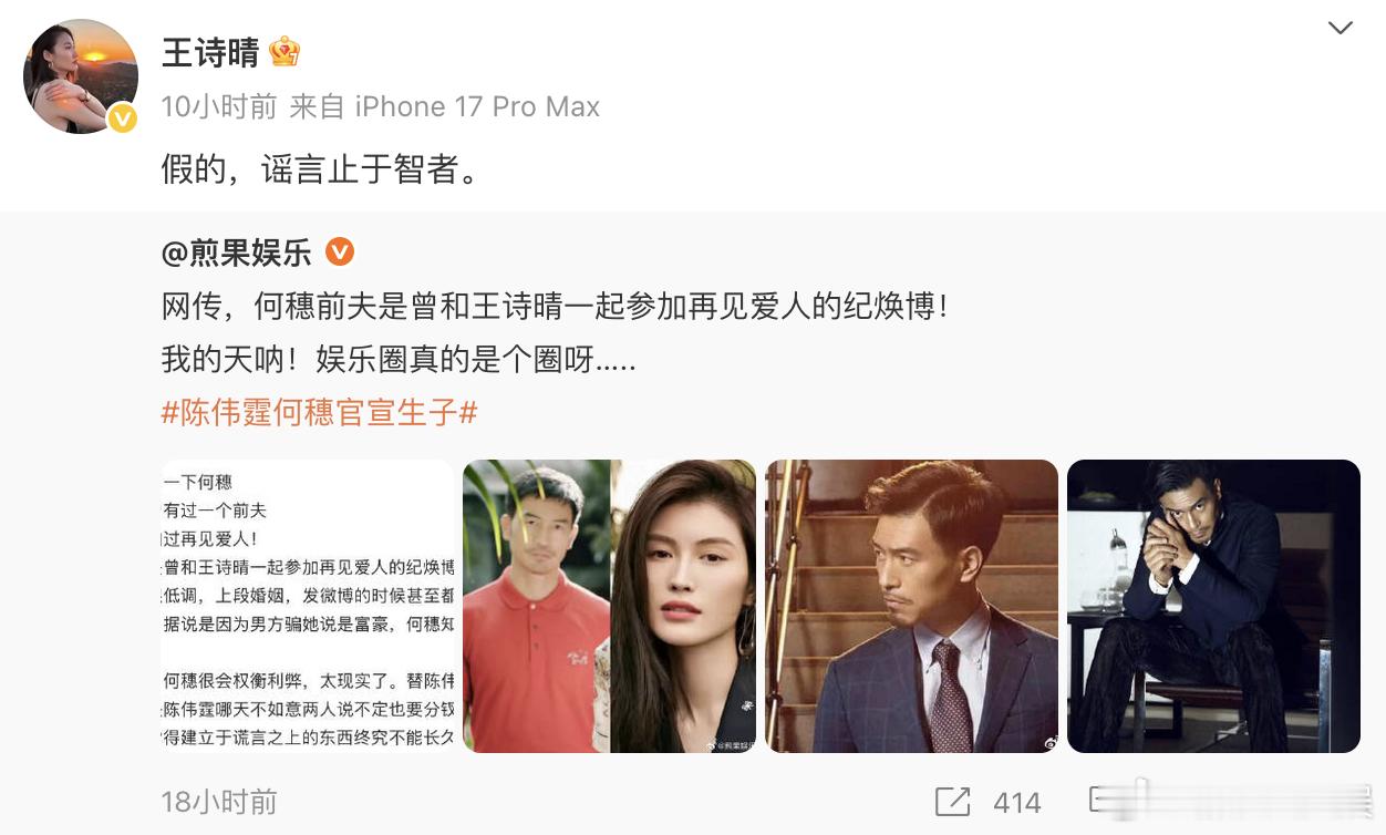 王诗晴辟谣 网传何穗前夫是曾和王诗晴一起参加再见爱人的纪焕博,王诗晴发文:“假的,谣言止于智者”。