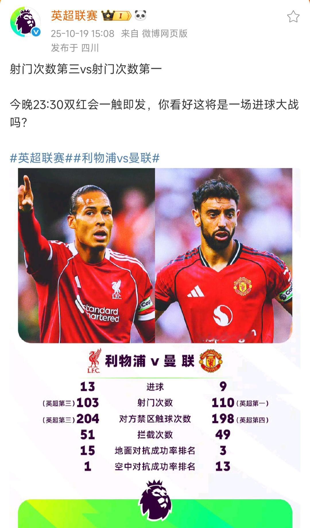 今天晚上双红会一定是狂轰乱炸。 曼联是英超射门次数第一的球队, 利物浦则是英