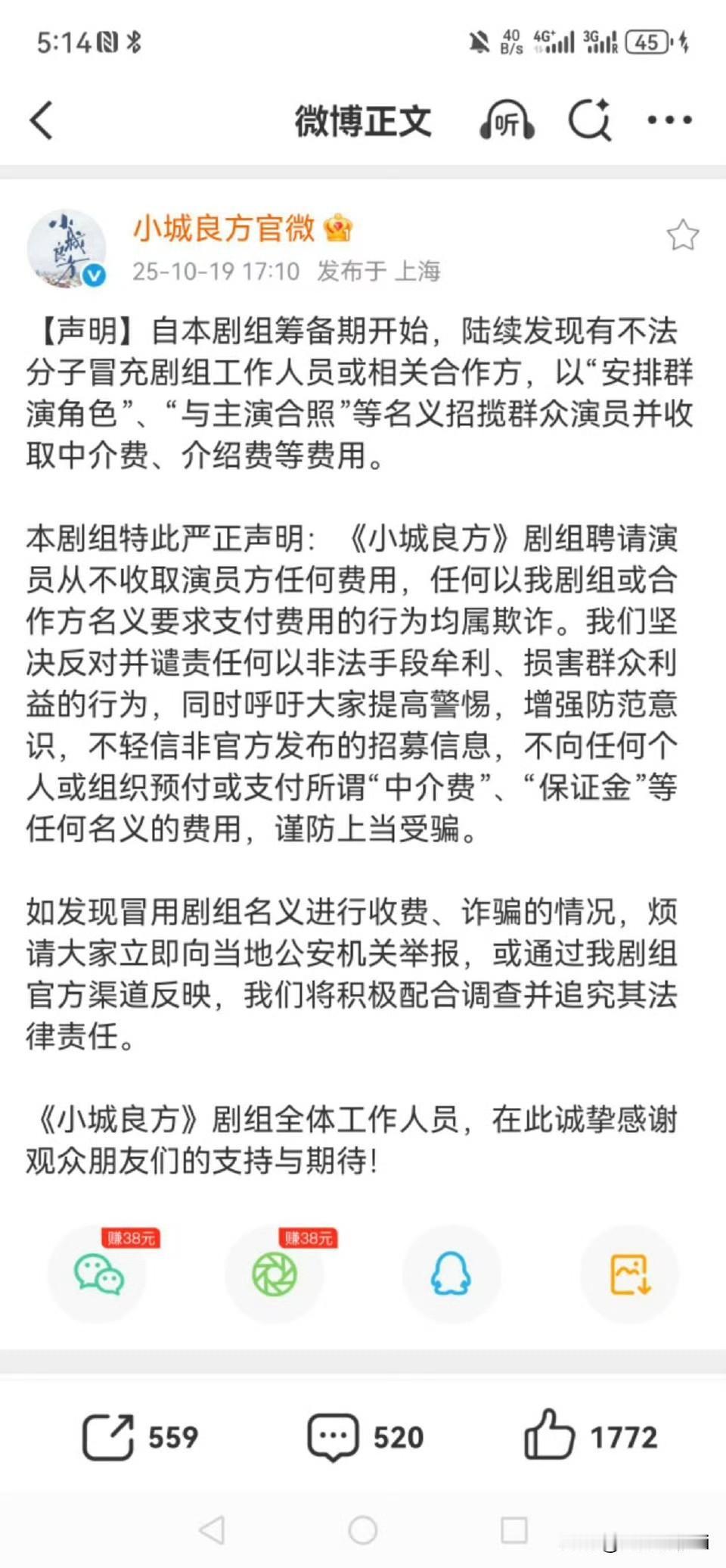 肖战《小城良方》剧组官方发布声明,剧组招收群演不收取任何费用,一切打着招群演收费