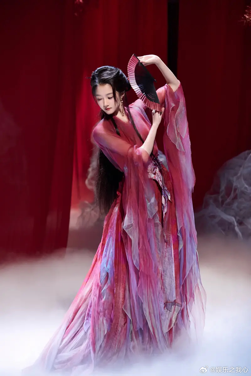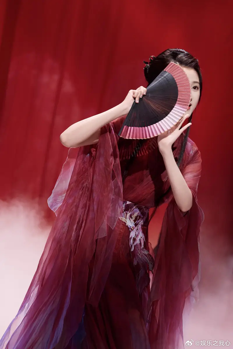 关晓彤一袭红衣执扇轻盈舞动 宛若画中美人妩媚明艳