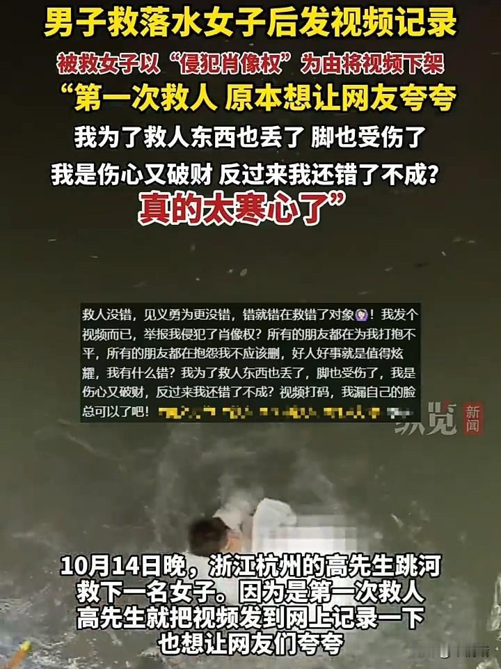做好事不应该是这种结果!浙江杭州一名男子跳河救上来一位女子,由于他是第一次救人,心里比较激动,所以就发了一段路人录制的视频,想记录一下自己的生活,也想让网友夸赞一下,但是视频刚发出不久,他就被那位他救上来的女子举报了,理由是侵犯肖像权,要求他立即下架视频,男子得知后瞬间懵了,因为他为了救那名女子,衣服都来不及脱就直接跳下水了,不仅在水里丢了东西,脚也被划伤了,最后还是自己一个人去医院治疗,可没想到等来的是这种结果,网友看完这段视频,都觉得善良的人不应该被这么对待,这名男子当初毫不犹豫地跳下水里去救女子,可以说他根本没有想过要得到什么回报,就连视频也是其他路人录制的,事后他只是想记录一下生活,再加上第一次救人比较激动,所以才会上传视频,可那位被救的女子不仅没有感谢他,对他的受伤丝毫不关心,反而还举报他的行为,这样的做法实在让人感到心寒,如果一个做了好事的人最后落得这种结局,那以后谁还敢做好事,会不会有更多女性因此被连累。大家怎么看呢?