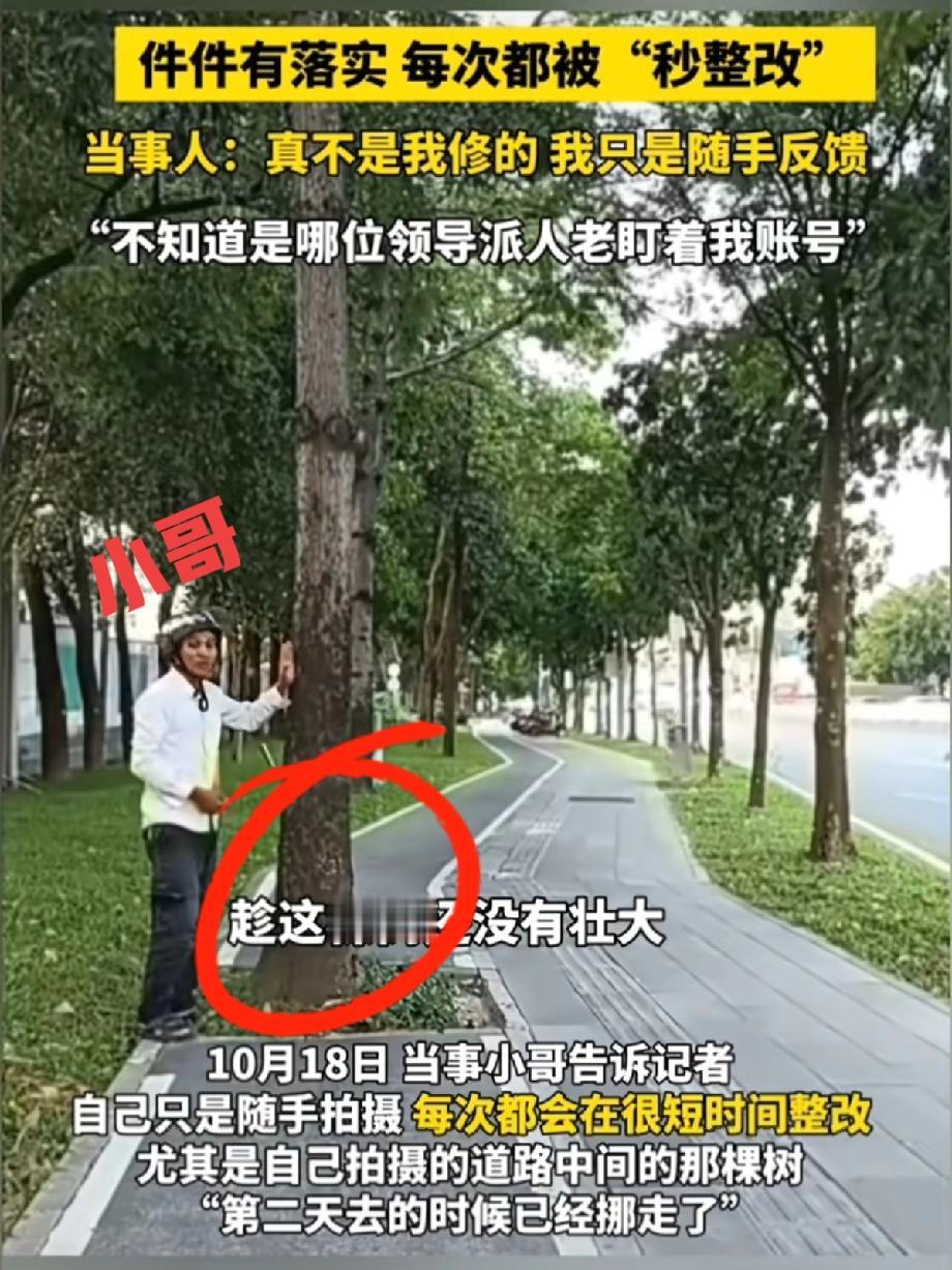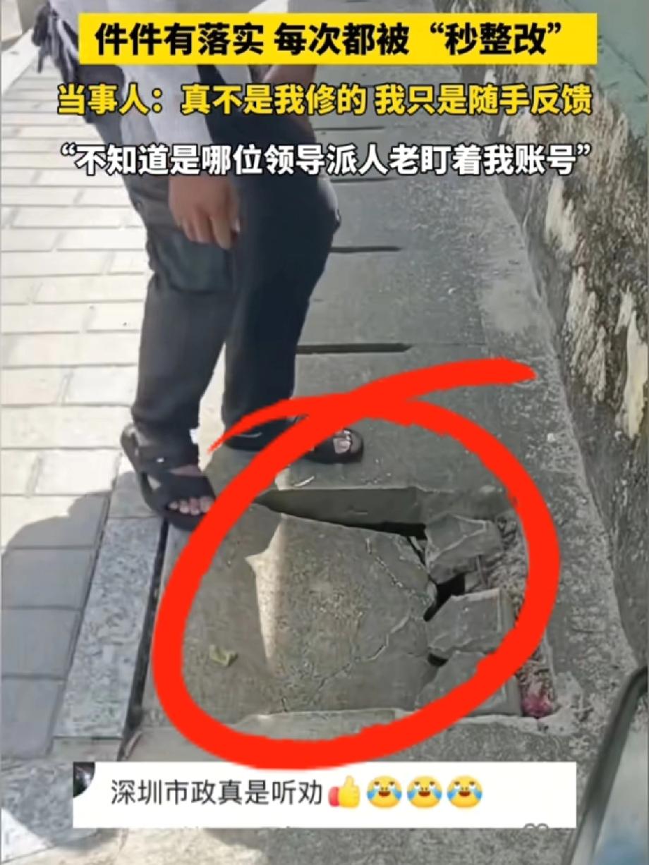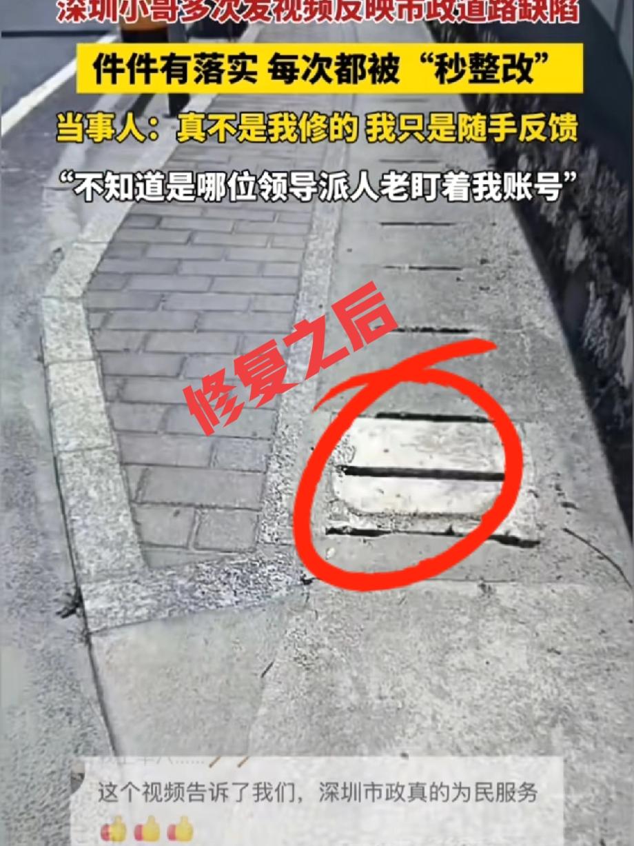 笑不活了,不知道是谁管谁了! 深圳一名小哥,他有一个特殊“爱好”,就是每天很喜欢在道路上检查,看看路面情况,只要发现路面上有缺陷,或者涉及到安全问题,就立刻去上面反映,这一做就是坚持两年了 但他没想到的是,他发现的问题发布视频之后,市政立刻解决,不会一丝犹豫!真想说深圳市政太给力了 有网友调侃说,市政领导是不是专门派一名工作人员,每天盯着这位小哥视频呢…这反应也太快了吧!政府这下每天上班第一件事,是不是看这位小哥有啥“指示”呢 说真的,深圳政府确实是一个模范,太值得学习了,把老百姓的心声当回事,不拖拉,有问题就上,这格局打开地妙啊! 深圳路道问题 社会
