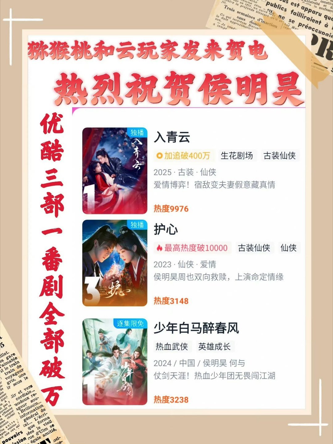恭喜侯明昊入青云热度破万优酷唯一三部一番全破万参演五部剧全破万扛剧能力真的强[
