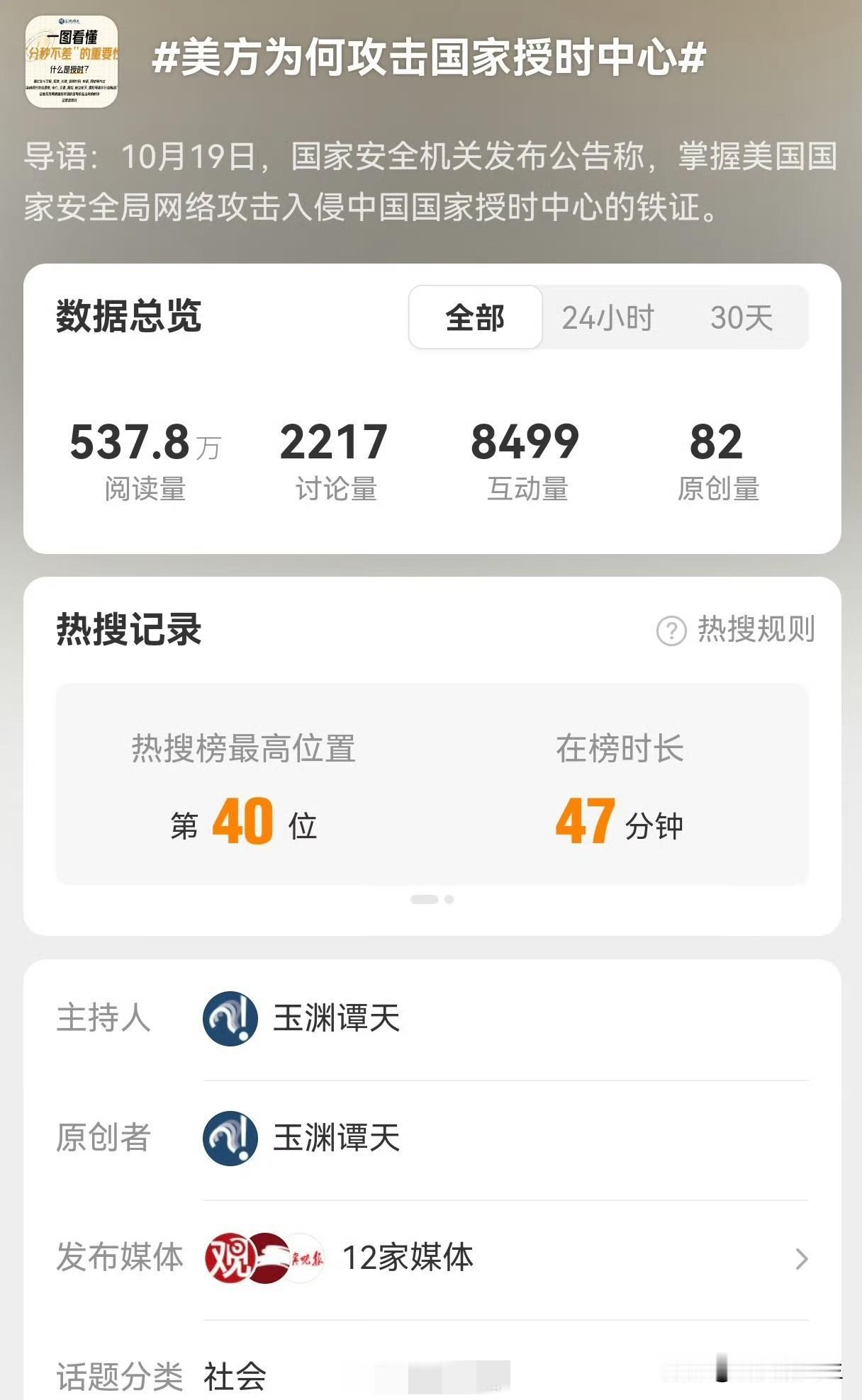 利用手机漏洞攻击国家关键基础设施还不如一个野人小孩的热度,我们的媒体都在关注什么? 10月19日央视报道的关于美国家安全局利用某手机漏洞攻击国家授时中心的新闻,只在热搜榜排到第40位,在榜时间仅仅47分钟,发布这条消息的媒体仅有12家。 看看今天的微博热搜榜,一个野人小孩的消息占据了热搜的前三位,除了野人小孩,还是野人小孩。一个外国攻击中国关键基础设施的新闻还不如一个野人小孩,看看我们的媒体都在干什么。