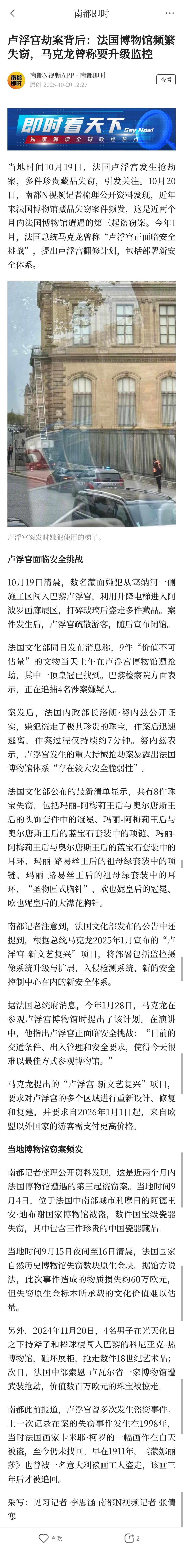 #法国博物馆两个月遭遇三起盗窃案#【卢浮宫劫案背后:法国博物馆频繁失窃,马克龙曾称要升级监控】#卢浮宫失窃藏品名气大到难以销赃#当地时间10月19日,法国卢浮宫发生抢劫案,多件珍贵藏品失窃,引发关注。10月20日,南都N视频记者梳理公开资料发现,近年来法国博物馆藏品失窃案件频发,这是近两个月内法国博物馆遭遇的第三起盗窃案。今年1月,法国总统马克龙曾称“卢浮宫正面临安全挑战”,提出卢浮宫翻修计划,包括部署新安全体系。