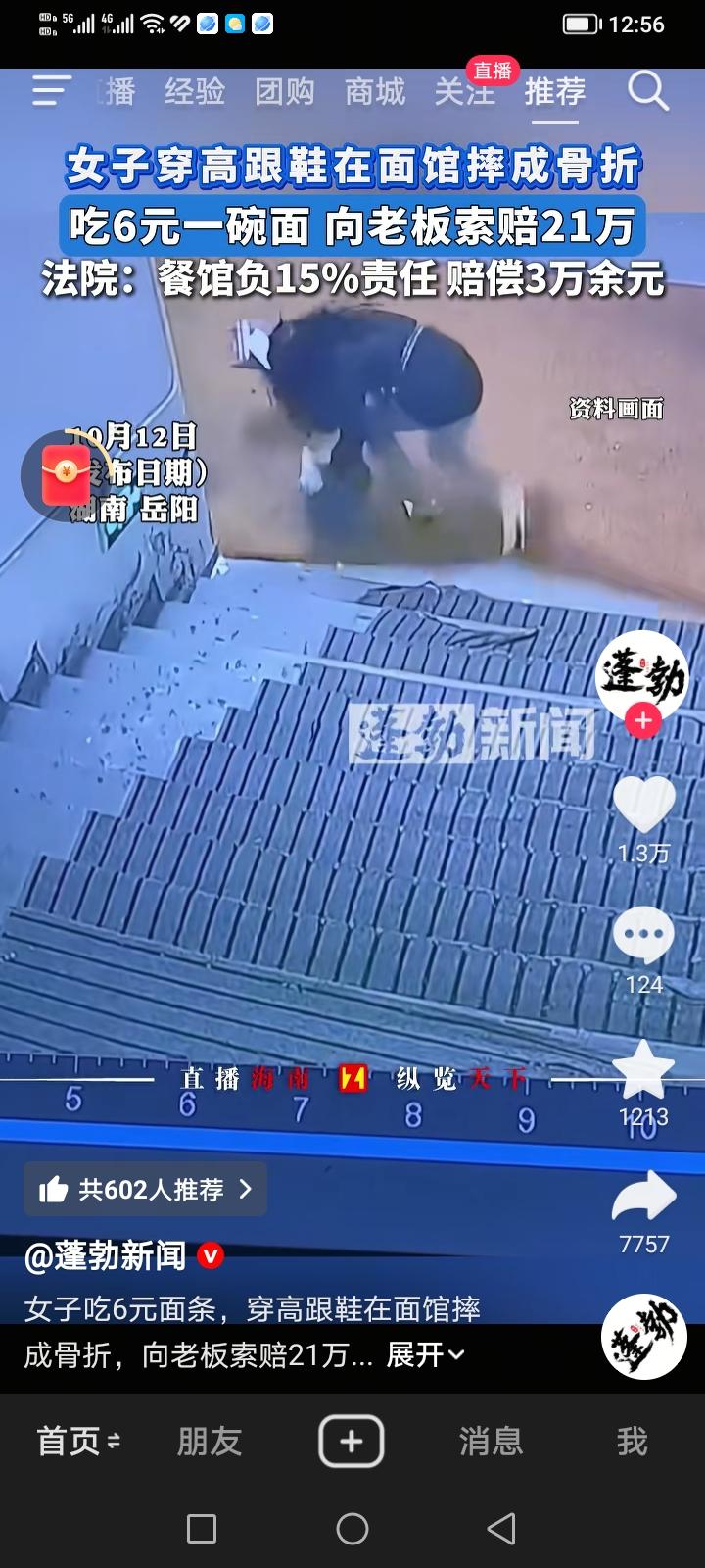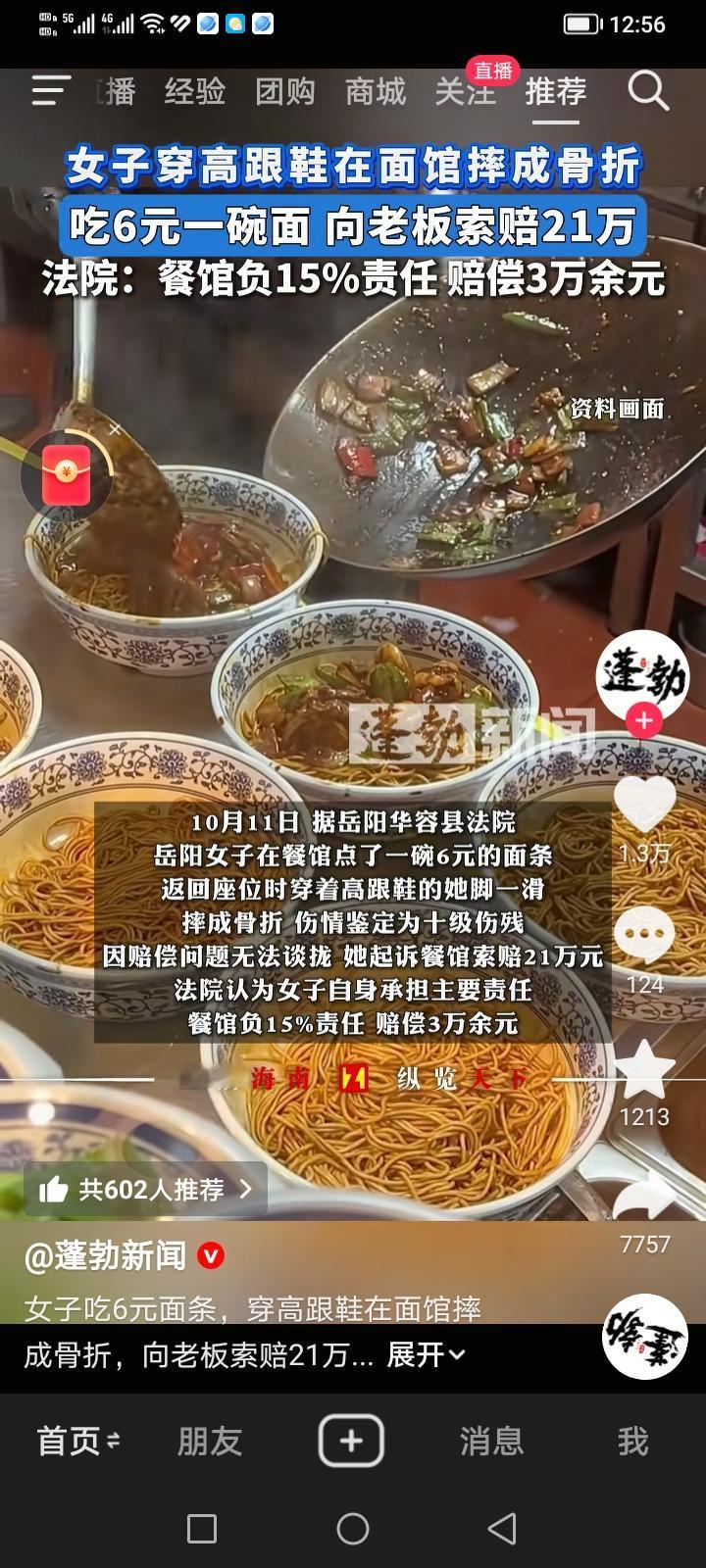 湖南岳阳一女子在餐馆点了一碗6元的面条,返回座位时,穿着高跟鞋的她在店内玻璃推拉