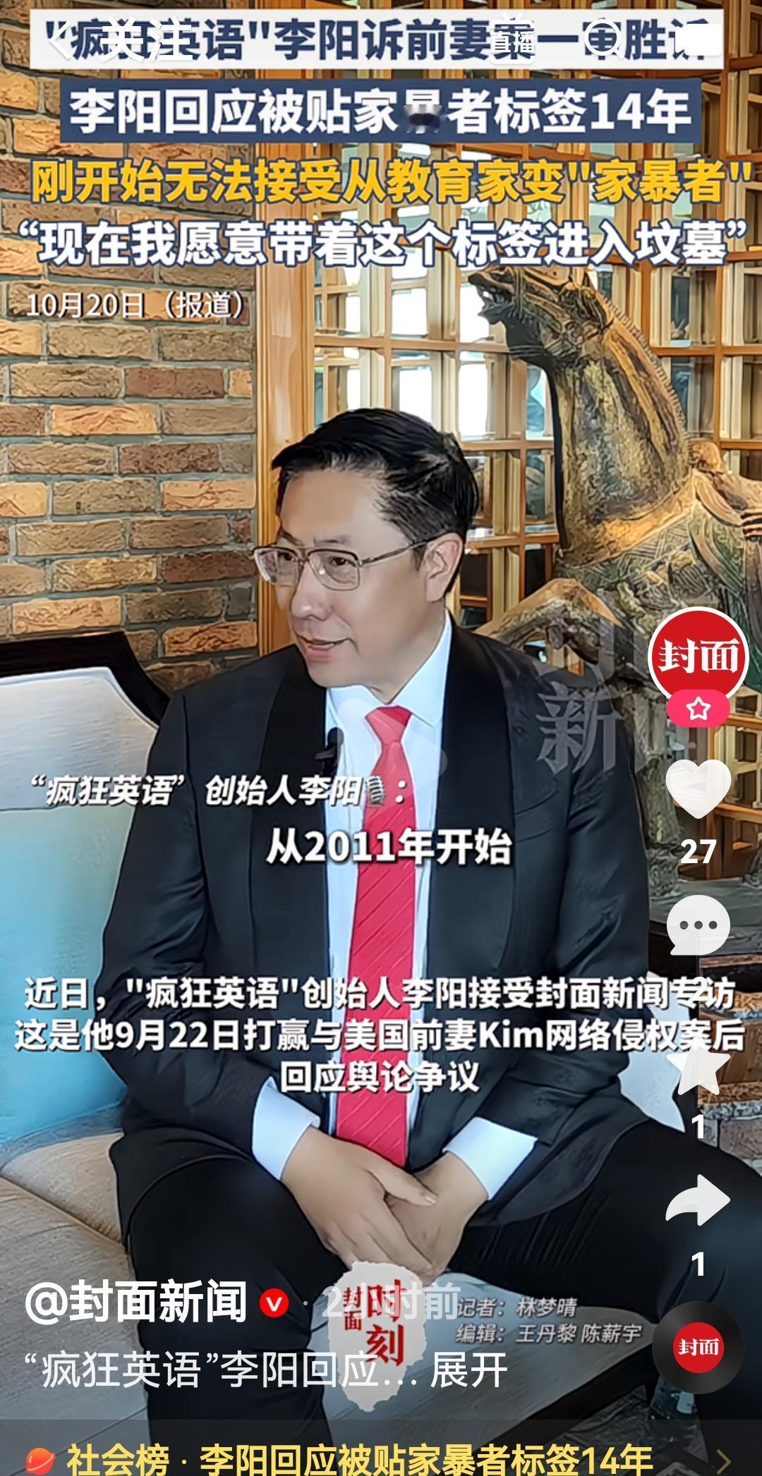疯狂英语创始人起诉美国前妻案一审胜诉 根据媒体报道,10月22日疯狂英语创始人李阳,就是李阳美国前妻发视频说李阳吼叫女儿被指控是殴打女儿,并且说疯狂英语属于“邪教”,李阳以名誉受损,导致学员退费解约为由起诉前妻 经过法院最终认定美国前妻所述不够真实 李阳说他从2011年被贴上家暴者标签14年,刚开始他自己也无法接受从教育这变成家暴者,但是现在愿意带着这个标签进入“坟墓” 他2011年家暴事件确实闹的挺大,以前疯狂英语确实牛,记得我们小县城他们都去演讲,当时在一些高中甚至比新东方影响力都大李阳家庭教育 李阳 李阳胜诉 李🥚阳 图片来自封面新闻视频