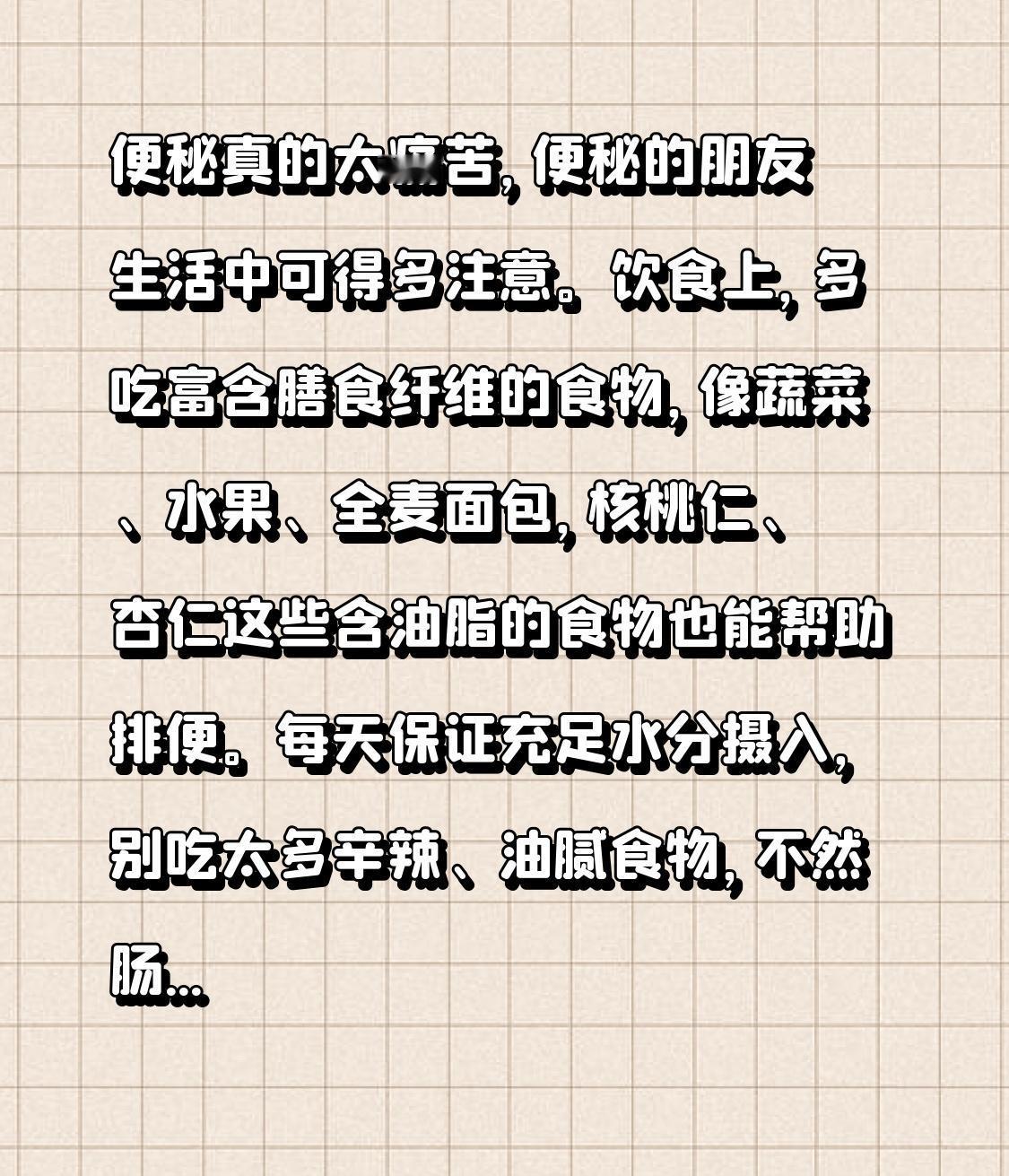便秘真的太痛苦,便秘的朋友生活中可得多注意。 饮食上,多吃富含膳食纤维的食物,像蔬菜、水果、全麦面包,核桃仁、杏仁这些含油脂的食物也能帮助排便。每天保证充足水分摄入,别吃太多辛辣、油腻食物,不然肠道更难受。 排便习惯得养好,每天固定时间去蹲马桶,就算没便意也坐会儿,慢慢培养排便反射。千万别憋便,不然大便干结更难排出。 运动也不能少,散步、慢跑、瑜伽都行,还能做做提肛运动。别老坐着,久坐会让肠道蠕动变慢。 另外,压力大也会导致便秘,试试冥想、深呼吸来放松。要是便秘严重,及时就医,排除器质性疾病。