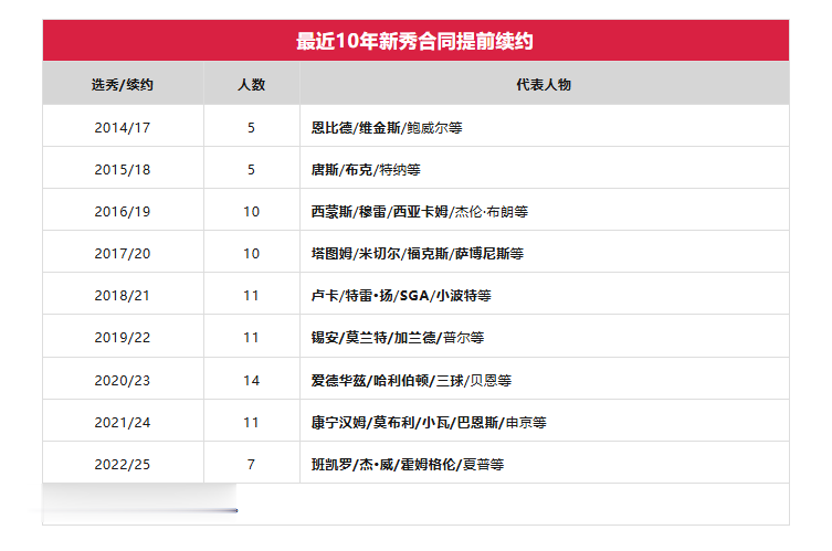 首轮新秀前两年无论打得好不好,合同都有保障,两年后球队决定是否持行第三年,三年级结束后决定是否执行第四年,或者在第四年开始前提前续合同,标准是4年,超级顶薪和指定新秀都是5年。这样新秀提前续约共分6档: