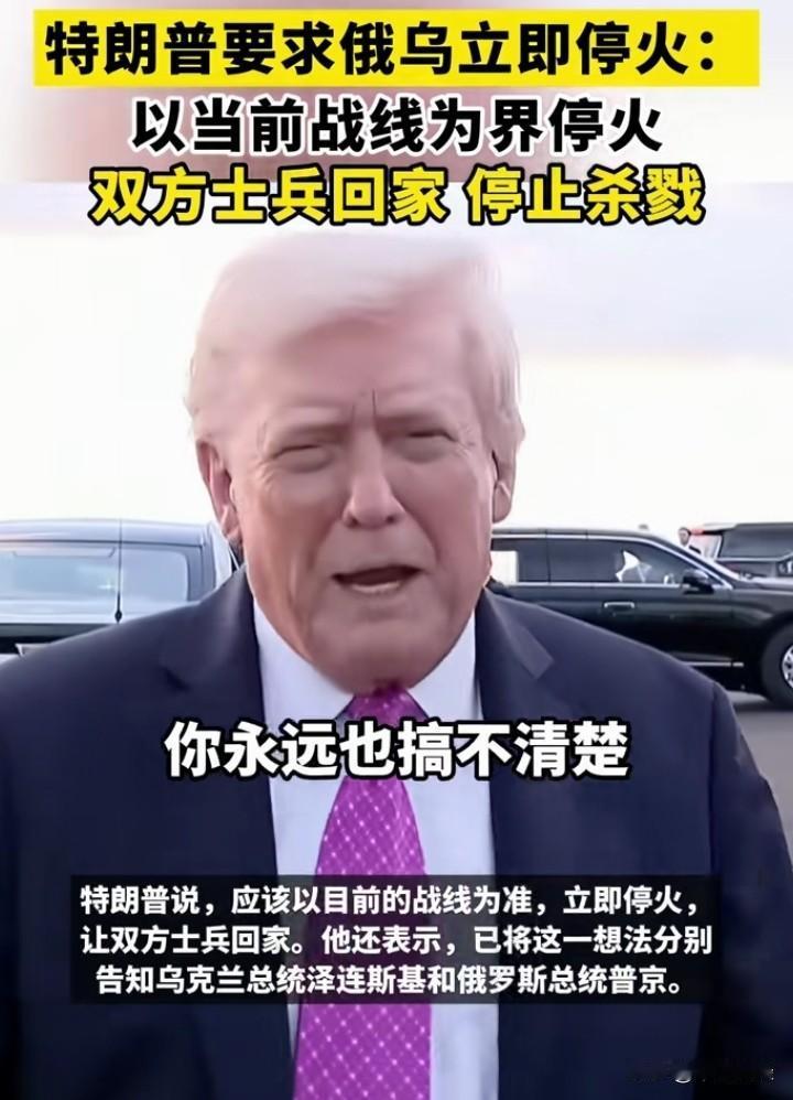 以当前战线停火,对乌克兰来说真不是啥好事。要是停火,乌克兰国土就会像朝韩三八线那样,领土保障成了大问题。 川子想让俄乌以当前战线停火,各自宣布胜利,这明显是为自己“建立功勋”。但真这么停火,乌克兰就输得底裤都没了。乌克兰若接受现状,可能得维持至少10年以上,可这领土残缺的日子,想想都糟心。 难怪,乌克兰总统泽连斯基立刻重申了领土原则。 曝美乌总统会晤特朗普数次语气强硬