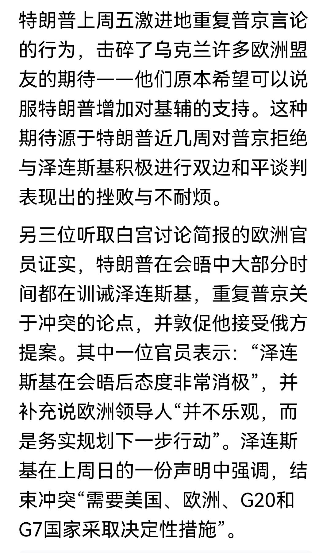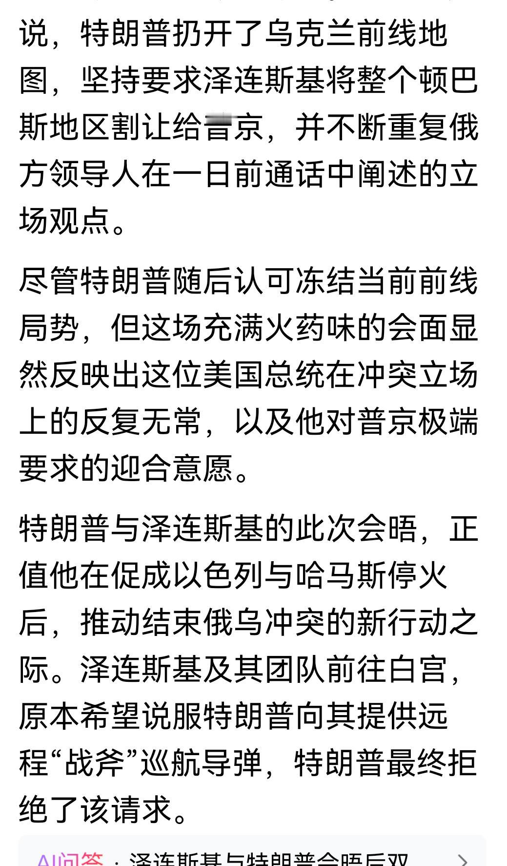 俄美达成了某种一致?特朗普成了普京的传话人,乌克兰成了大国之争的牺牲品! 有报道称,最近,乌克兰总统泽连斯基去美国寻求支持,想让美国给其提供远程“战斧”巡航导弹,结果被美国总统特朗普果断拒绝。而且在会晤中,特朗普敦促泽连斯基无条件接受俄罗斯提出的结束冲突的全部条件,还要把仍在乌克兰控制下的顿巴斯部分地区也划给俄罗斯。并警告称,否则,乌克兰将被摧毁。 这次会晤,完全击碎了乌克兰及其欧盟支持国的期待,乌克兰成为弃子的命运已经在劫难逃!