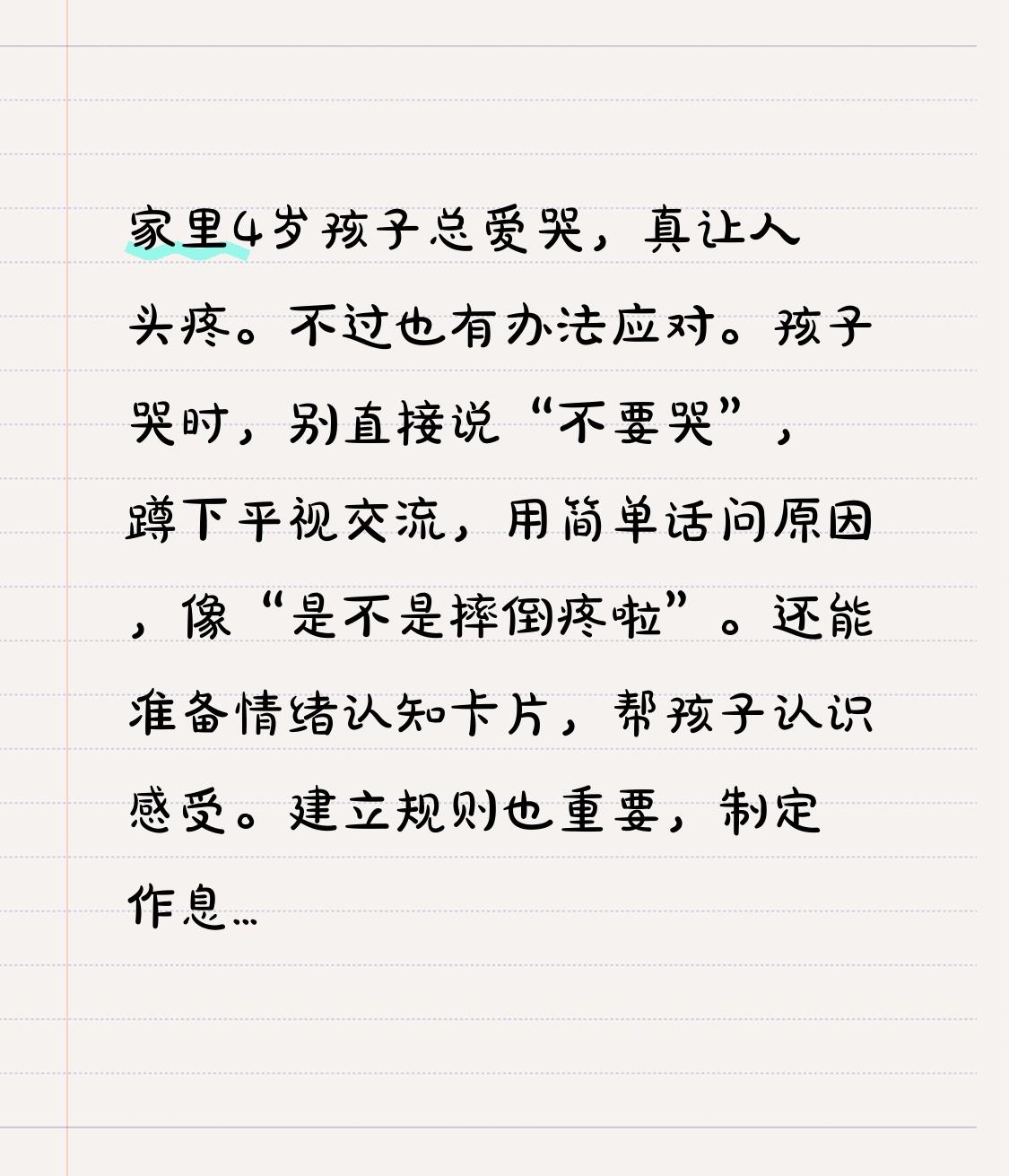 家里4岁孩子总爱哭,真让人头疼。不过也有办法应对。 孩子哭时,别直接说“不要哭”