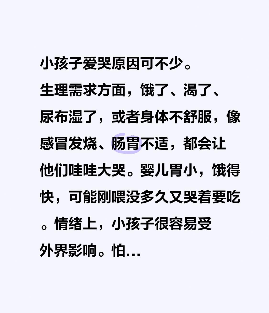 小孩子爱哭的原因着实不少。在生理需求层面,饥饿、口渴、尿布湿了,亦或是身体不适,